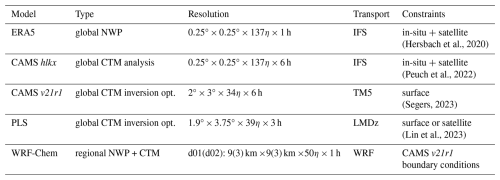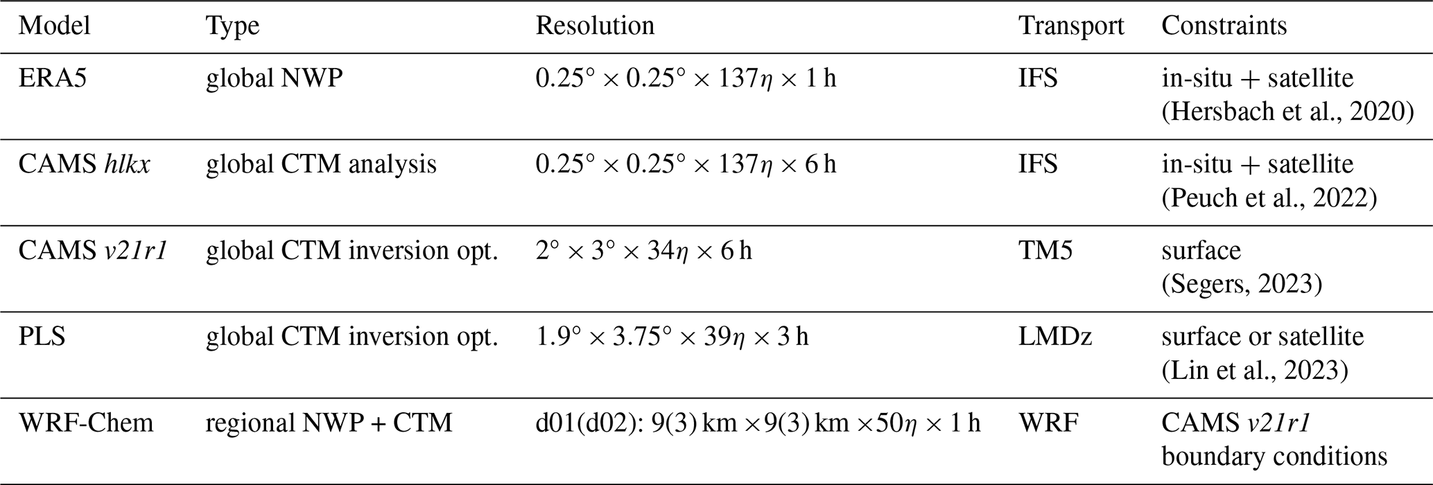 Table 2Model specifications for simulations used in this study. η vertical coordinates are a hybrid sigma-pressure coordinate. Meteorologicalonstraints can be from in-situ measurements such as weather balloons or measurement towers. For CH4 we use surface to specify that constraints come from surface mixing ratio measurements.
