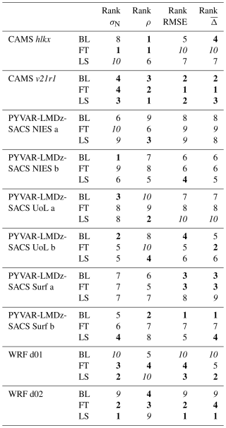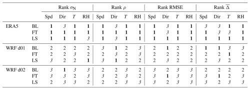 ERA5 generally outperformed WRF in wind speed metrics across the three atmospheric layers, as shown in Fig. 3. It ranked first in normalized standard deviation (σN) and RMSE for all layers, as well as in correlation (ρ) for the BL and FT. Specifically, ERA5 achieved a top rank in 75 % of wind speed metrics (9 out of 12, Table 3), compared to WRF d01 (16.7 %) and WRF d02 (8.3 %). For example, in the BL, ERA5 ranked first in σN, ρ, and RMSE, though it ranked third in bias (), where WRF d01 performed best. Similarly, in the FT, ERA5 maintained its top position across all wind speed metrics except for , where WRF d01 ranked first. In the LS, ERA5 continued to rank first in σN, RMSE, and but fell short in ρ, where WRF d01 and d02 performed better. These results highlight ERA5's consistent strength in reproducing observed wind speeds in all metrics.