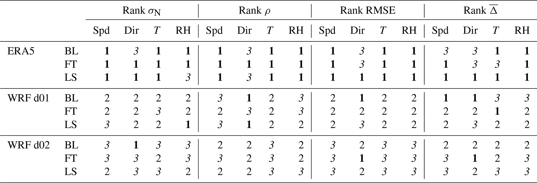 Table 3Simulation rank depending on the meteorological quantity assessed for the three atmospheric layers and the four statistical metrics considered in the study. Spd refers to wind speed, Dir to wind direction, T to temperature and RH to relative humidity comparisons. Best performance (rank 1) shown in bold, poorest performance (rank 3) in italics.