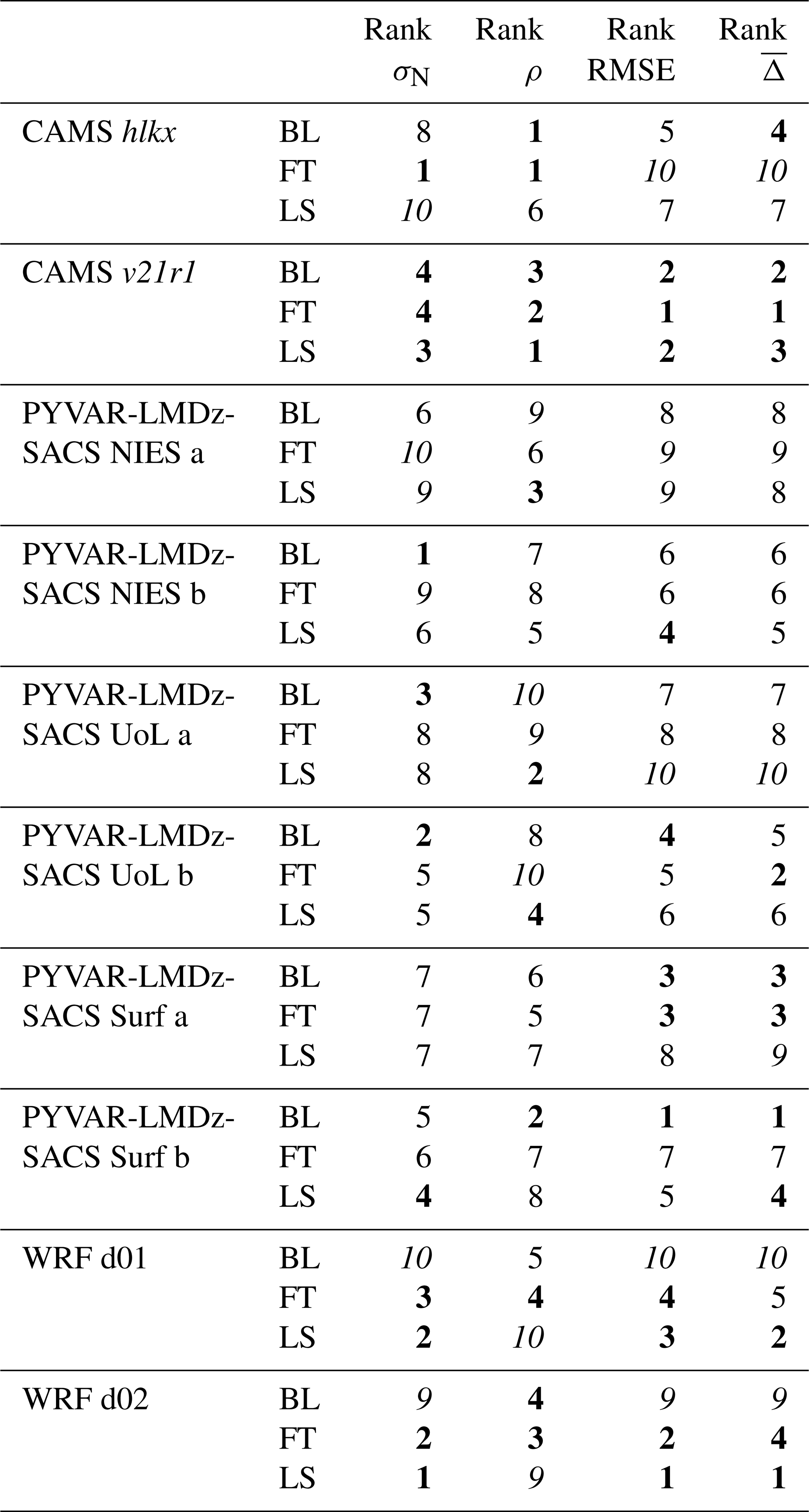 Table 4CH4 simulations ranking for the three atmospheric layers and the four statistical metrics considered in the study.Best performance (1–4) shown in bold, poorest performance (9–10) in italics.