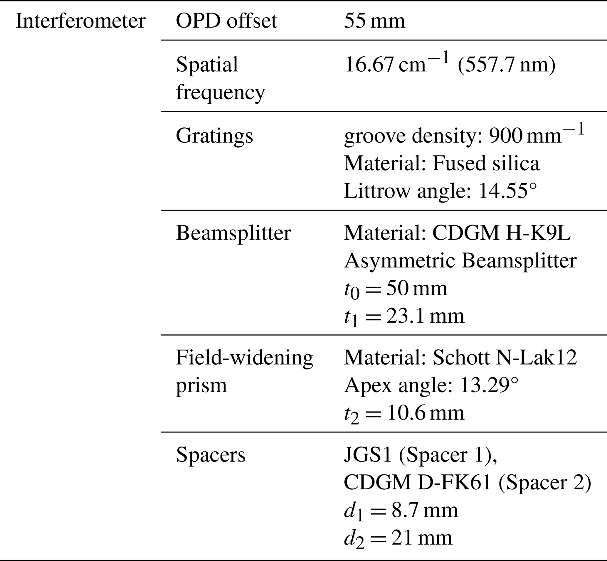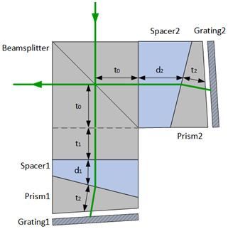 The configuration of the ASHS interferometer is similiter to the design of Wei et al. (2020), as shown in Fig. 2. Here t0 represents the nominal thickness of the beamsplitter, while t1 refers to the additional asymmetric extension in thickness, t2 is the thickness of the prism, d1 and d2 are the thickness of spacer 1 and spacer 2, respectively.