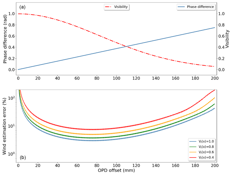 Figure 3(a) The visibility and sensitivity response to OPD offset. (b) The error of wind retrieval in different OPD offset. Each line is an average of Monte Carlo simulation with 10 000 samples. VI(x) is the visibility function as described in Eq. (1).