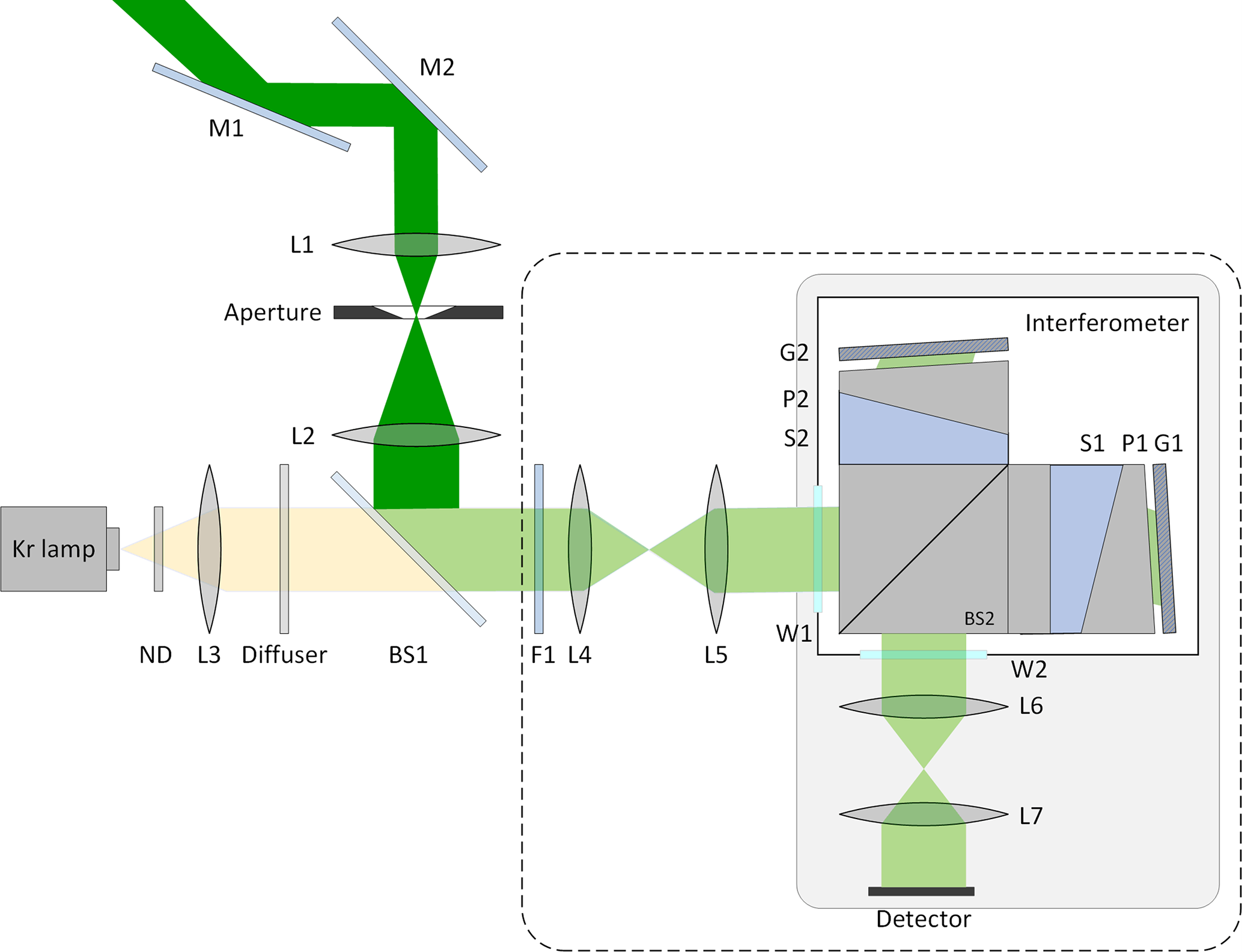 The M1, M2 mirrors are installed on a two-axis all-sky scanning system to collect airglow radiation in 45° elevation and zenith directions. The telescope L1 to L2 and the aperture stop are designed with a full field of view of 9° to ensure high luminous flux and signal-to-noise ratio of the instrument. The calibration line (λ = 557.029 nm) from a krypton lamp is attenuated by neutral density filter (ND) to an intensity that is comparable to the atomic oxygen green line. The collimated and holographically diffused calibration line is transmitted by a beamsplitter BS1 and enters the relay lens. The airglow and the calibration signal, collimated by relay lenses L4 to L5, both enter the interferometer and produce fringe images. F1 is a narrow band filter with a center wavenumber of 557.7 nm and a band width of 2 nm, so that background radiation and other spectral lines of the krypton lamp are suppressed.