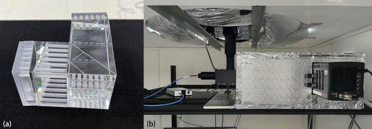 Figure 5The monolithic ASHS interferometer (a) and assembled ASHS instrument (b). All spacers are made into a hollow structure to reduce the thermal expansion.
