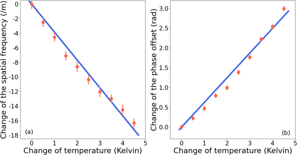 Figure 7 shows the response of spatial frequency and phase offset to the change of temperature. Each point represents the average of approximately 44 measurements. The solid lines are the result of a linear least squares fitting. The spatial frequency and the phase offset are linearly correlated with temperature, which are −0.038 cm−1 °C−1 and 0.624 rad °C−1, respectively. The thermal sensitivity, in conjunction with a precision temperature control system, restricts thermally induced phase drift to a detectable range. The residual thermal drift can be monitored and compensated through a synchronous calibration line (Harlander et al., 2010).