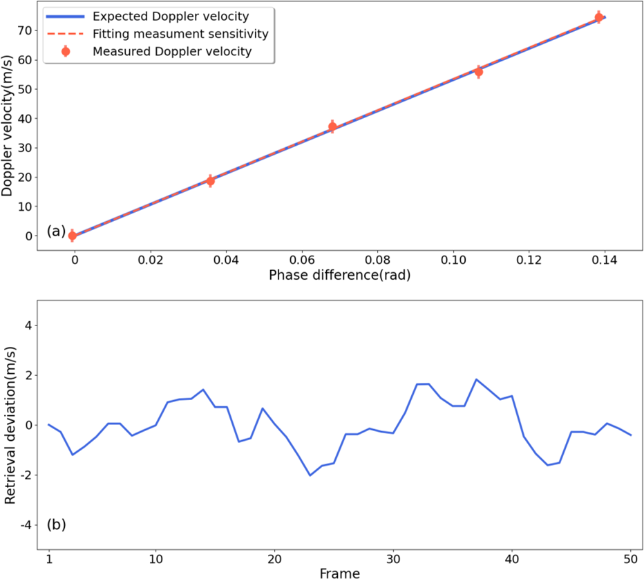 A Doppler-shift generator is established as shown in Fig. 8. A krypton lamp is used for illumination. The light is focused onto a high-speed rotating disk covered with retroreflective film, which reflects the light back along its original path. This reflected light is then directed by a beamsplitter into the interferometer. A narrow band filter is applied to select krypton emission line at 557.029 nm entering the interferometer. The disk is driven by an electric motor which is set at 1000–5000 RPM (revolutions per minute) corresponding to a Doppler velocity of 18.6–93.1 m s−1. Ten frames of interferograms are recorded for each speed in the experiment. The first ten frames at 1000 RPM serve as a baseline, representing a condition analogous to the zenith overhead wind. This approach ensures that the signal-to-noise ratio (SNR) remains uniform across all frames. After image correction and phase extraction, the phase difference is obtained by subtracting the baseline from an average phase of ten frames of interferogram at different speeds.