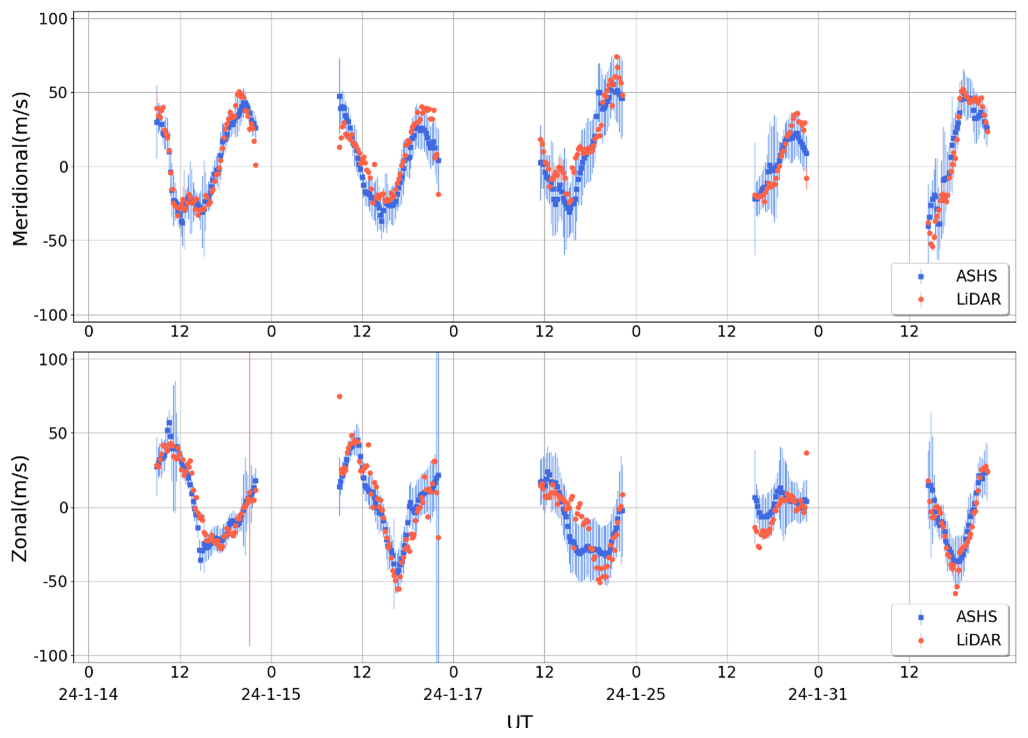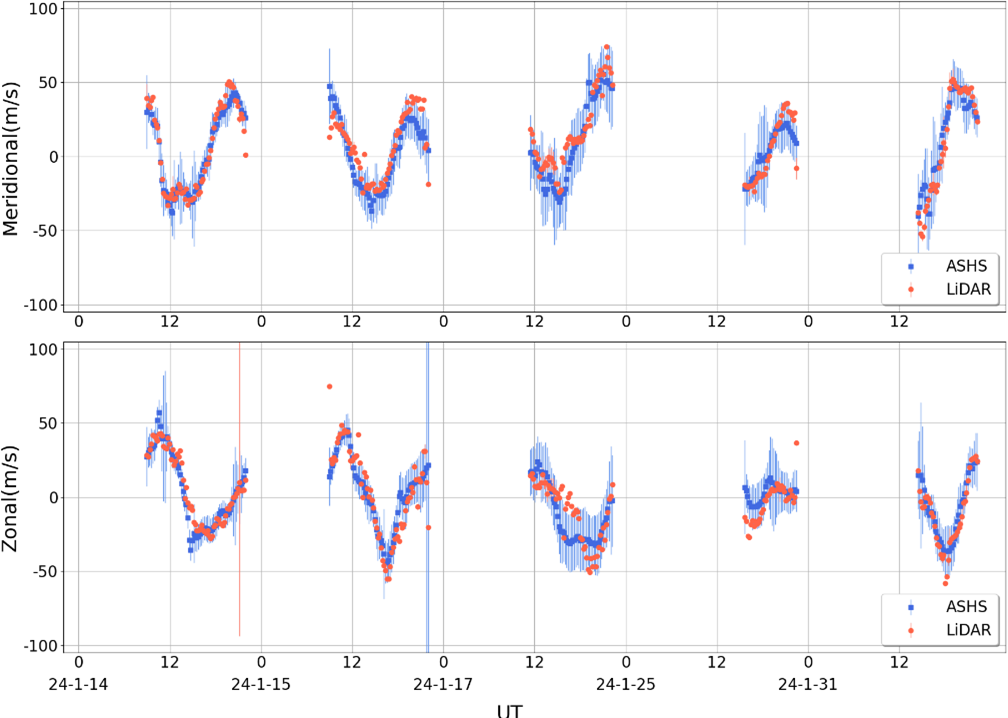 To facilitate a comparative analysis of the correlation between data obtained from two distinct systems, it is imperative to standardize the observational outcomes. For this purpose, data from both ASHS and LiDAR systems, collected during overlapping observation periods spanning 5 d in January 2024. Given the disparate observation frequencies of these systems, piecewise linear interpolation was employed to synchronize their time series. Subsequently, the average horizontal wind component aligned with the north-south axis was designated as the meridional wind, while that aligned with the east-west axis was identified as the zonal wind. The processed time series results, with a five-minute interval, are presented in Fig. 12. The upper and lower panels of the figure illustrate the meridional and zonal wind results, respectively. Within the figure, red dots signify LiDAR observations, whereas blue dots represent observations from the ASHS interferometer. Notably, the observational data from both instruments exhibited good agreement on the nights of the 14 and 15 January. However, from 17 to 31 January, a certain degree of deviation was observed, which may primarily be attributed to inaccuracies in the weighted average calculation of LiDAR detection results across various altitudes. The spatial and temporal variability in the height distribution of oxygen atom OI 557.7 nm airglow necessitates a more precise weighted average computation, based on the specific airglow emissivity height distribution prevalent in the region on the respective day.