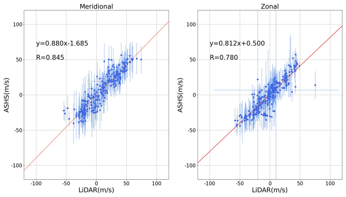 The meridional and zonal wind measurements from the ASHS and the LiDAR exhibit a satisfactory consistency in terms of both the temporal synchronization and the magnitude of wind variations. This congruency not only attests to the reliability of the ASHS in capturing wind dynamics but also underscores the comparability of the two distinct measurement systems. Additionally, the consistency of the east-west zonal wind and north-south meridional wind is confirmed by the measurements, as the ASHS instrument's observations in opposite directions corroborate each other. Furthermore, the measured zenith wind remained close to zero throughout the night, indicating strong instrument stability.