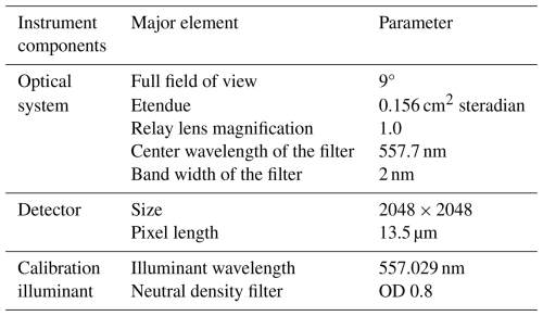 To the authors' knowledge, existing ground-based ASHS instruments are limited to observing the atomic oxygen red line in the middle and upper thermosphere. To extend wind measurements to a lower altitude region, it is advantageous to additionally observe the green line, which has its intensity peak just above the mesopause at around 96 km and spanning a layer approximately 10 km thick (Zhang and Shepherd, 2005). Detecting this faint emission from the ground is challenging due to the low layer's thinness. The scattering of artificial light sources in the lower atmosphere can reduce the sensitivity and precision of the detection.