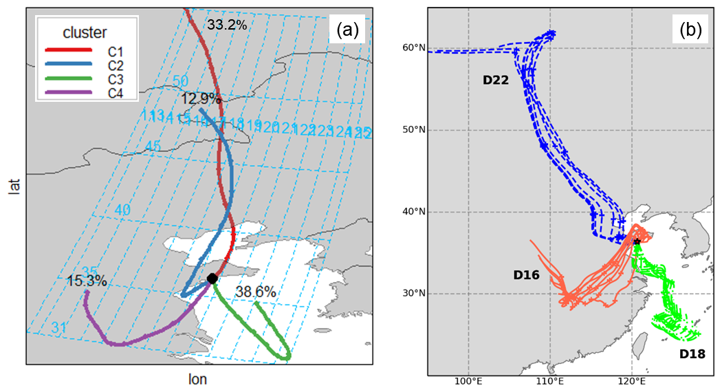 Figure 1(a) Result of the 4-cluster analysis of the AMBTs calculated during the sample collection at Qingdao, showing representative pathways for the clusters and their percentage occurrence; (b) examples of 50 m AMBTs for samples classified as N (Sample D22, blue dash), SW (D16, red solid) and YS (D18, green dot-dash) types.