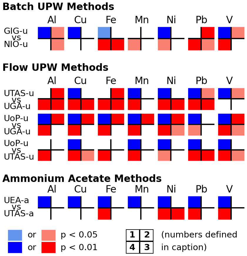 Figure 2Summary of the statistical comparisons of the leaching methods for all of the 26 samples (N, SW and YS) collected at Qingdao. Comparisons are only shown for similar methods: Batch UPW (GIG-u and NIO-u), Flow UPW (UoP-u, UTAG-u and UGA-u) and AmmAc (UEA-a and UTAS-a). Statistical tests (as detailed in Sect. 2.6.3) shown in quadrants are (1) Spearman's Rank Correlation, (2) one-tailed t-test of slope versus 1 ± 0.12 uncertainty, (3) intercept equals zero, and (4) Wilcoxon Signed Rank Test. Significant test results are indicated by the color code: blue indicates agreement between methods, red indicates disagreement, and white indicates that the test result was not statistically significant. Full statistical test results (all tests and elements) can be found in Fig. S4.