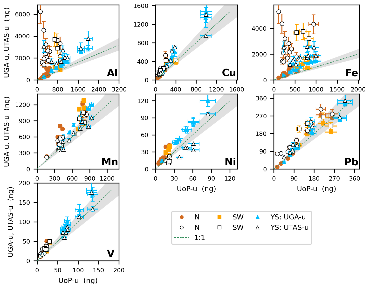 One striking observation from Figs. 2 and 4 is the lack of correlation between Al and Fe measured by UoP or UGA and that measured by UTAS (similar behavior was also observed for Ti, Ba and U, as shown in Fig. S1). High Al and Fe masses reported by UTAS could stem from the absence of a backing filter in the UTAS method, whereby the soluble fraction of trace elements measured can include the contribution of particles with a diameter greater than 0.2 µm. As shown in Figs. 4 and S2, this observation is even more obvious in aerosol samples influenced by terrestrial air-masses (N and SW samples) due to lower solubility of Fe and Al in these samples when compared to YS samples. The absence of a backing filter in the UTAS protocol only seems to influence lithogenic elements with lower solubility (Al, Fe, Ti, Ba, U), while more soluble elements (Cu, Mn, Ni, Pb and V) showed a significant correlation (p<0.01) with the other two methods investigated. No filtration in the UTAS UPW flow-through protocol may also be responsible for higher uncertainty obtained for lithogenic elements when measuring three replicate samples (Table 6).