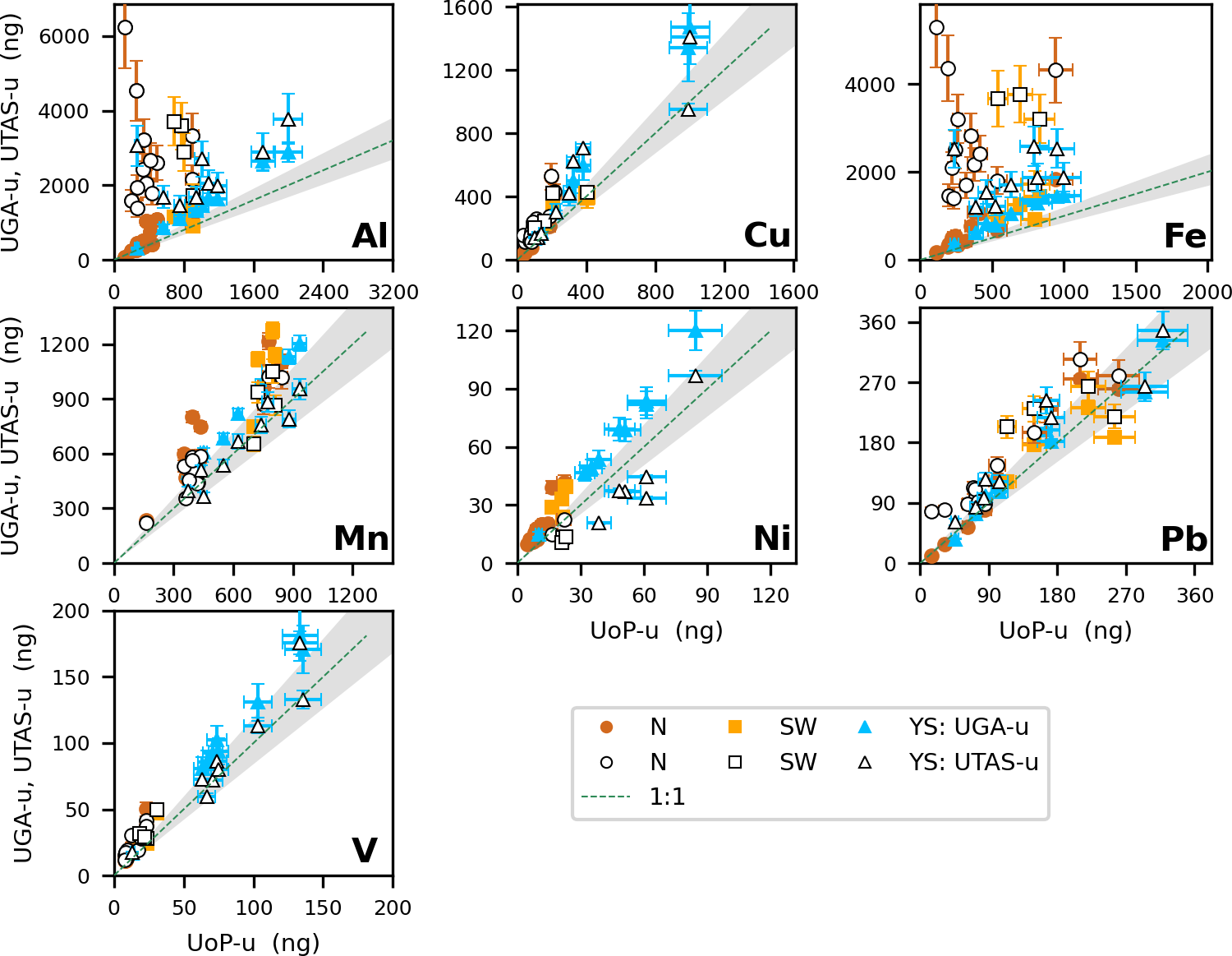 The UTAS UPW flow-through method produced soluble trace element measurements that positively and significantly correlate with the two other methods (Fig. 2), except for Al and Fe. Overall, UTAS measurements were higher than those of UoP (Fig. 4), except for low Ni measurements (compared to both UoP and UGA) which result from elevated Ni blank correction in UTAS data treatment (due to new Ni cones used in the SF-ICP-MS instrument, Table S9).