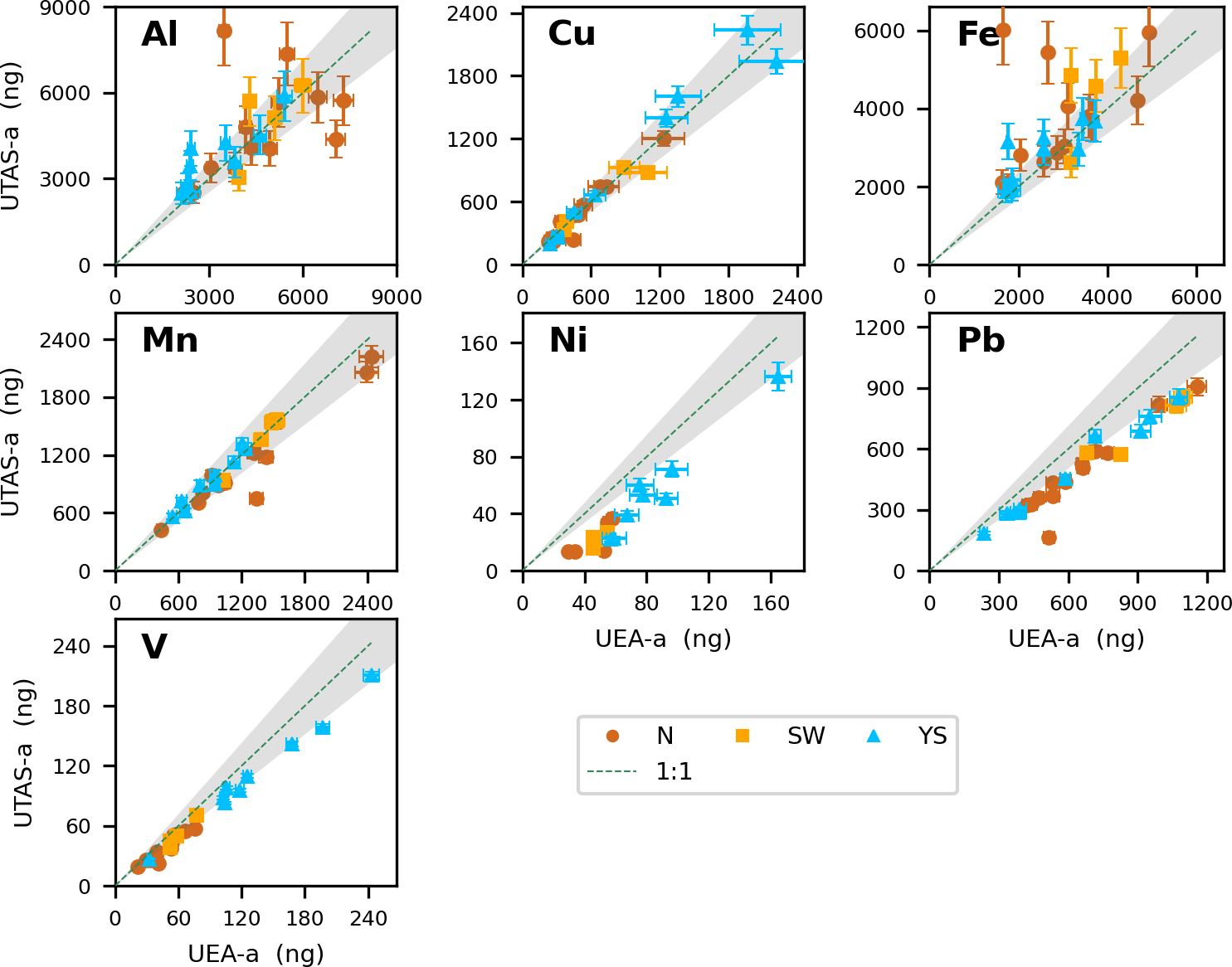Poorer agreement between the two methods was again found for lithogenic elements (Al and Fe), although comparisons were noticeably better for the AmmAc methods (Fig. 5) than for the UTAS-u to other UPW flow-through method comparisons (Fig. 4). For these two elements (Al and Fe), measurement differences were more pronounced in samples influenced by “terrestrial” air masses (N and SW) while YS samples showed a good agreement (Figs. 5, S5 and S6). This better agreement for lithogenic elements between the AmmAc methods may suggest that the > 0.2 µm particles which are not removed by the UTAS UPW leaching protocol are largely soluble in AmmAc so that their trace element content is not removed by 0.2 µm filtration in the UEA method.