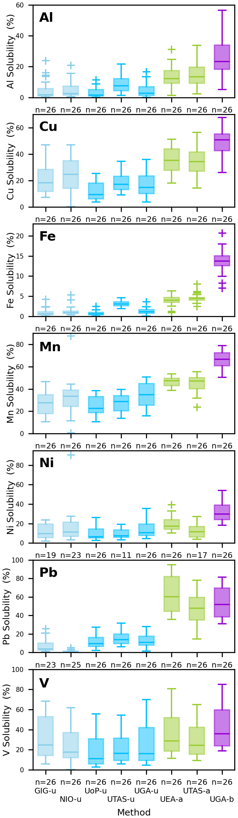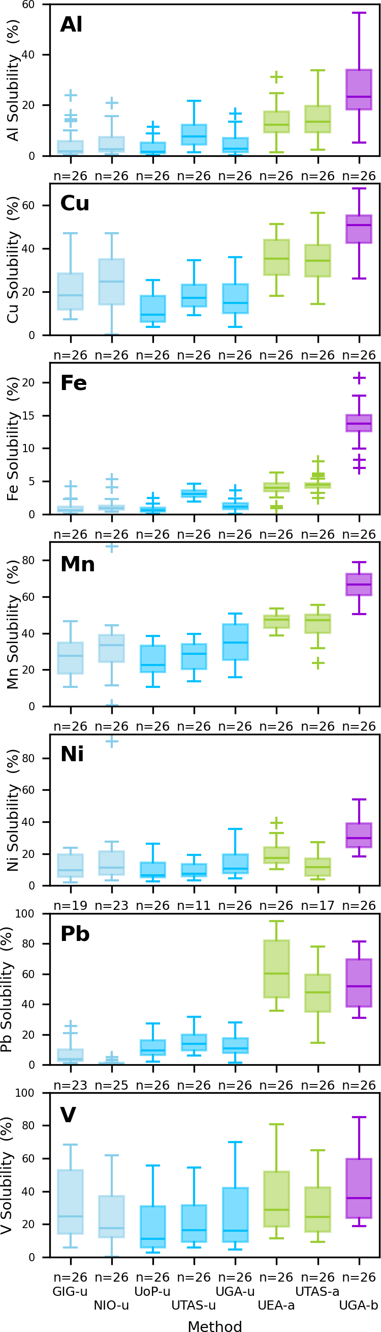 Figure 6Box and whisker plots of solubility (in %) for Al, Cu, Fe, Mn, Ni, Pb and V in the Qingdao samples determined using the eight leaching protocols tested in this study. Colors indicate method type: batch UPW (light blue), flow UPW (dark blue), AmmAc (green), and acetic acid with hydroxylamine hydrochloride (purple).