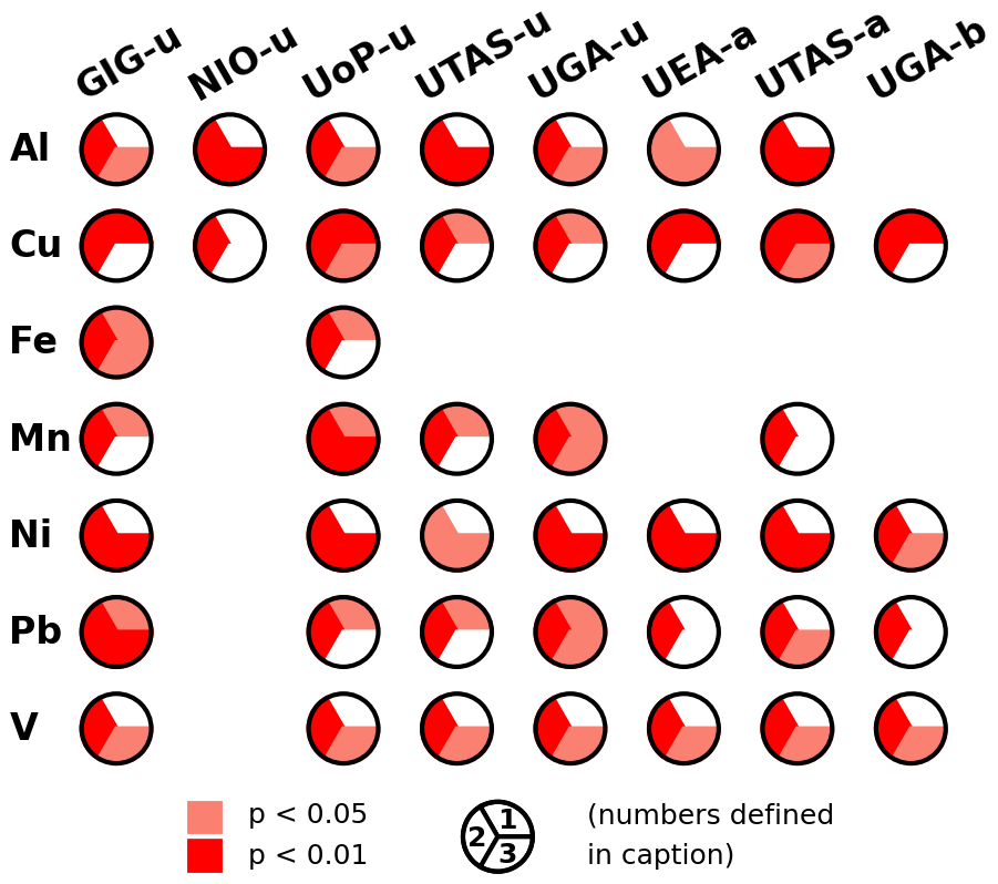For four (GIG, NIO, UGA and UTAS) of the six groups participating this work, the magnitude of the uncertainty in each intercomparison subsample was determined by multiplying its measured soluble mass by its respective relative MAD value. The other two groups (UEA and UoP) reported individual uncertainties for the intercomparison subsamples based on calibration uncertainties and repeated analyses of single subsample extract solutions. In the latter cases, the uncertainties of the soluble trace element mass measurement in individual subsamples were taken to be whichever of the replicate-determined or individually-determined uncertainties was larger.