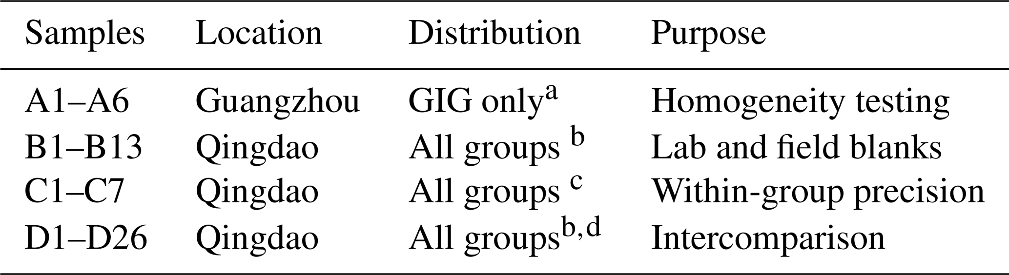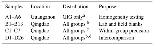 The 33 samples (and six lab blanks and seven field blanks, B1–B13) collected in Qingdao were distributed to all participating laboratories for soluble trace element analysis. Seven of these samples (C1–C7) were used to assess intra-method precision with each laboratory receiving three subsamples of two filter samples (Table 2). Furthermore, each laboratory received one portion of each of the remaining 26 filter samples (D1–D26) for conducting the leaching method intercomparison. These sub-samples (D1–D26) each had a sampled air volume of 59 m3, which can be used to convert data presented in this study into atmospheric concentrations. One subsample of each of the Qingdao samples was also retained at GIG for total trace element determination, and the last subsample was reserved for future as yet undetermined usage.