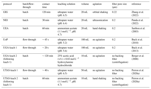 Table 3Overview of the eight leaching protocols used by the six laboratories participating in this intercomparison study.
