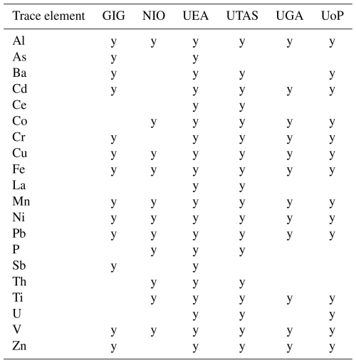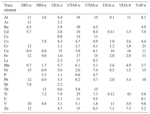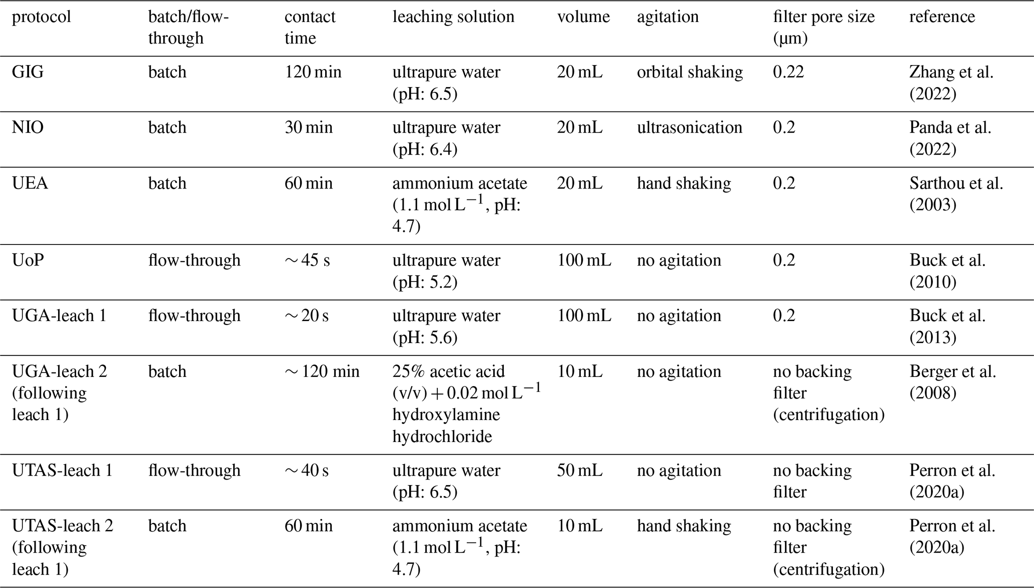 Table 3 provides an overview of the laboratory leaching protocols investigated in this study; more details can be found in Tables S1–S6 in the Supplement. Each laboratory analyzed the samples they received using only the method associated with them in Table 3. UGA and UTAS both employed a two-stage protocol with successive leaching (termed leach 1 and leach 2, hereafter) and therefore reported two values for each trace element. A total of eight leaching protocols were examined in this study.