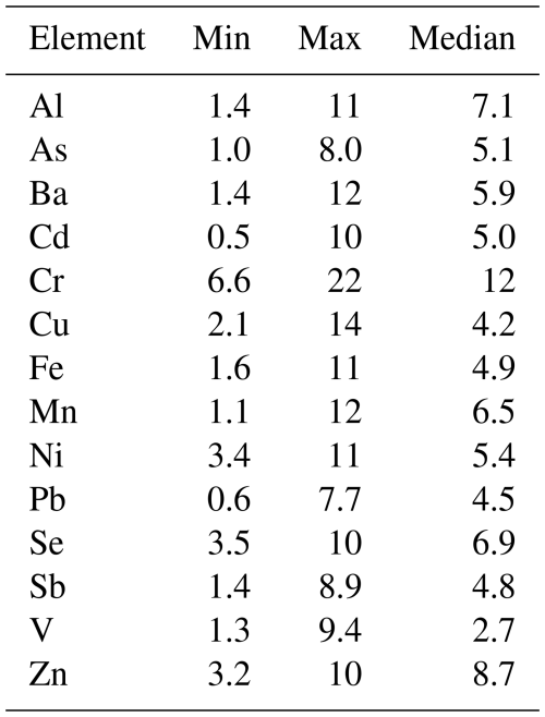 Table 5 summarizes the relative MAD values obtained for total trace elements contained in the Guangzhou samples (A1–A6). The median of relative MAD values obtained for the 14 trace elements ranged from a minimum of 2.7 % for V to a maximum of 12 % for Cr. In this work, we chose a conservative approach by applying the highest median relative MAD value (i.e. 12 %) to represent the uncertainty associated with trace element distribution heterogeneity over a filter, regardless of the element analyzed. Variations between different methods greater than this 12 % heterogeneity are likely to be due to differences in analytical results, as described in Sect. 2.6.3.