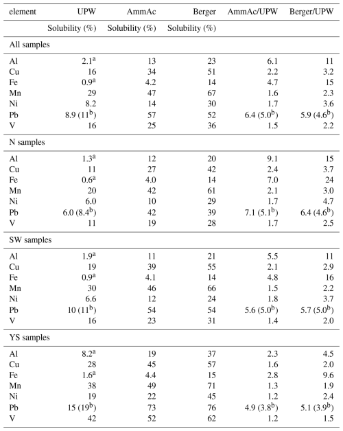 Table 7Median trace element solubilities for the Qingdao aerosol samples, determined from the combined soluble element masses determined for the methods using UPW (GIG-u, NIO-u, UoP-u, UTAS-u and UGA-u), AmmAc (UEA-a and UTAS-a) and Berger (UGA-b), and solubility ratios of the AmmAc to UPW (AmmAc/UPW) and Berger to UPW (Berger/UPW) methods. (a: excluding UTAS-u due to the inclusion of > 0.2 µm particles, b: excluding GIG-u and NIO-u due to unexplained inconsistencies in Pb data).