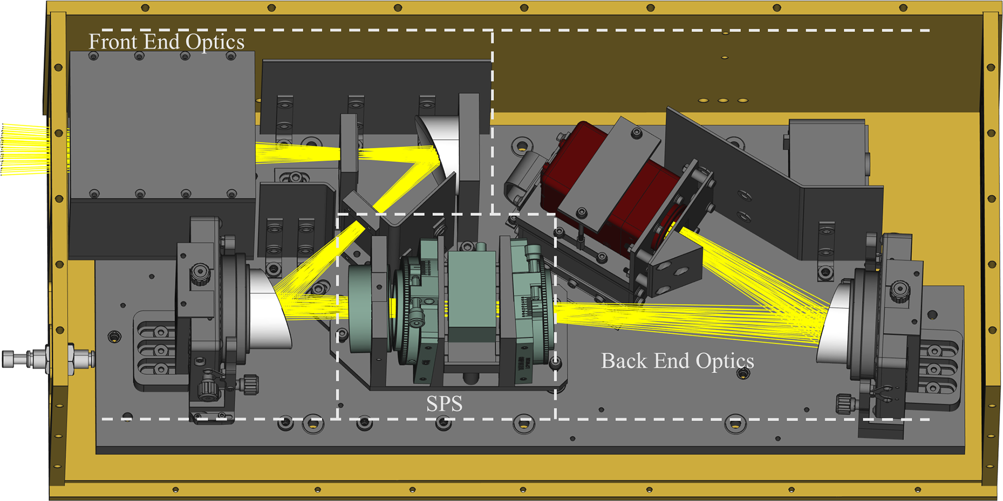 Figure 1Render of ALI optical layout. The front-end optics consists of a baffle, stops, and two off-axis parabolic mirrors providing angular magnification. The spectral and polarization selection (SPS) sub-system is comprised of four components (listed front to back): the liquid crystal rotator (LCR), a vertically orientated linear polarizer, the AOTF, and a horizontally orientated linear polarizer. The back-end optics comprises one off-axis parabolic mirror focusing a spectrally filtered and polarized image onto the detector.