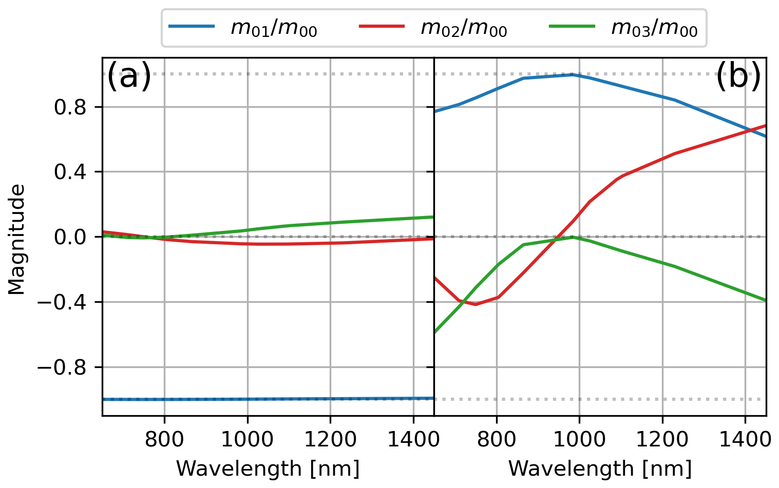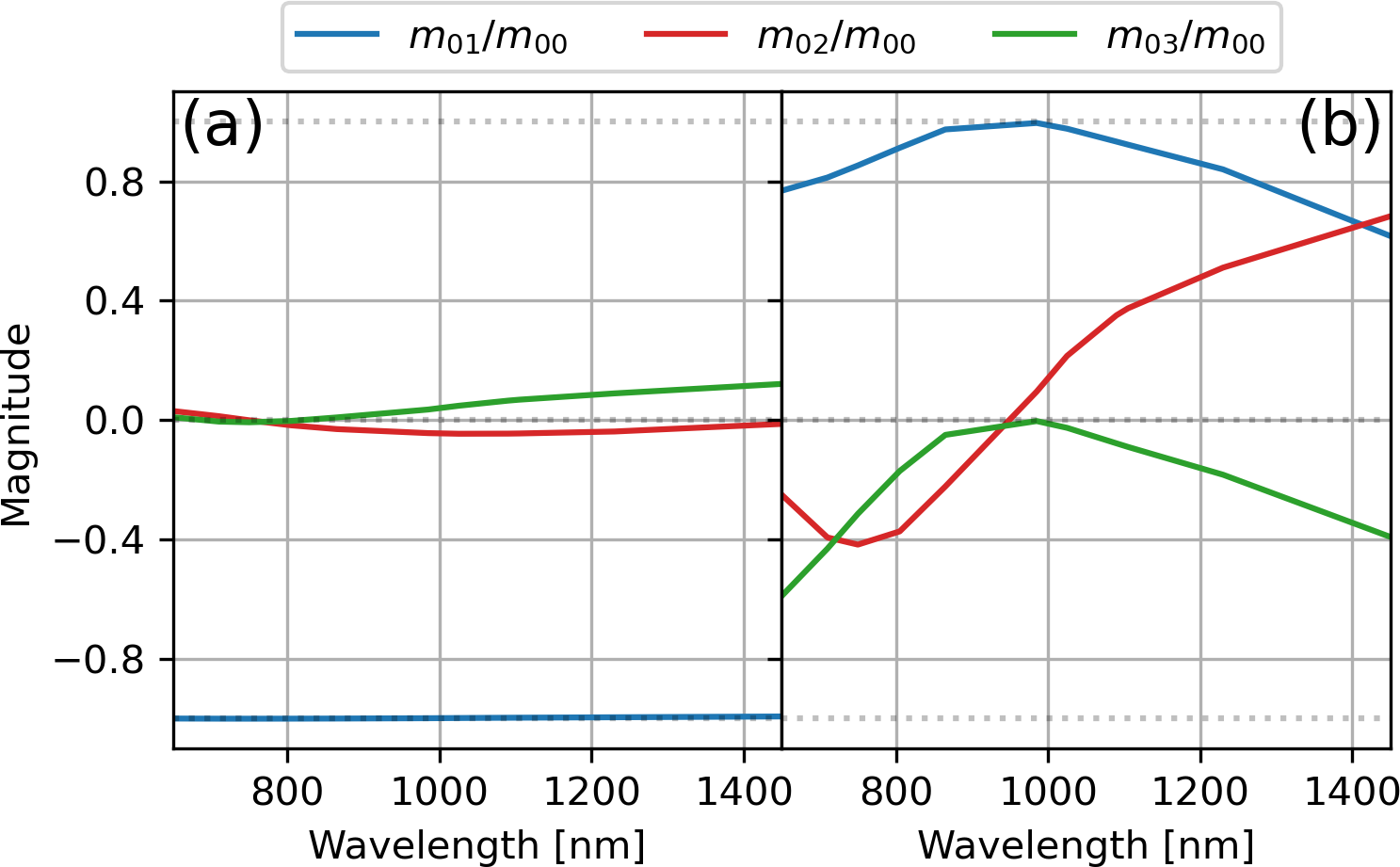 Figure 3Non-ideal polarimetric response of ALI (Letros et al., 2024) is shown as normalized coefficients of the first row of the Muller matrix, which dictates the measured Stokes parameter I′. Panel (a) is the response of the LCR-on state. Panel (b) is the response of the LCR off state. The coefficient of shows the proportional transference of Qatmo into I′. Likewise, and show the same for Uatmo and Vatmo respectively. An ideal ALI response would have in the LCR-on state and in the LCR off state, as well as and for both cases – i.e. purely vertical linear polarization with the LCR on and purely horizontal linear polarization with the LCR off.