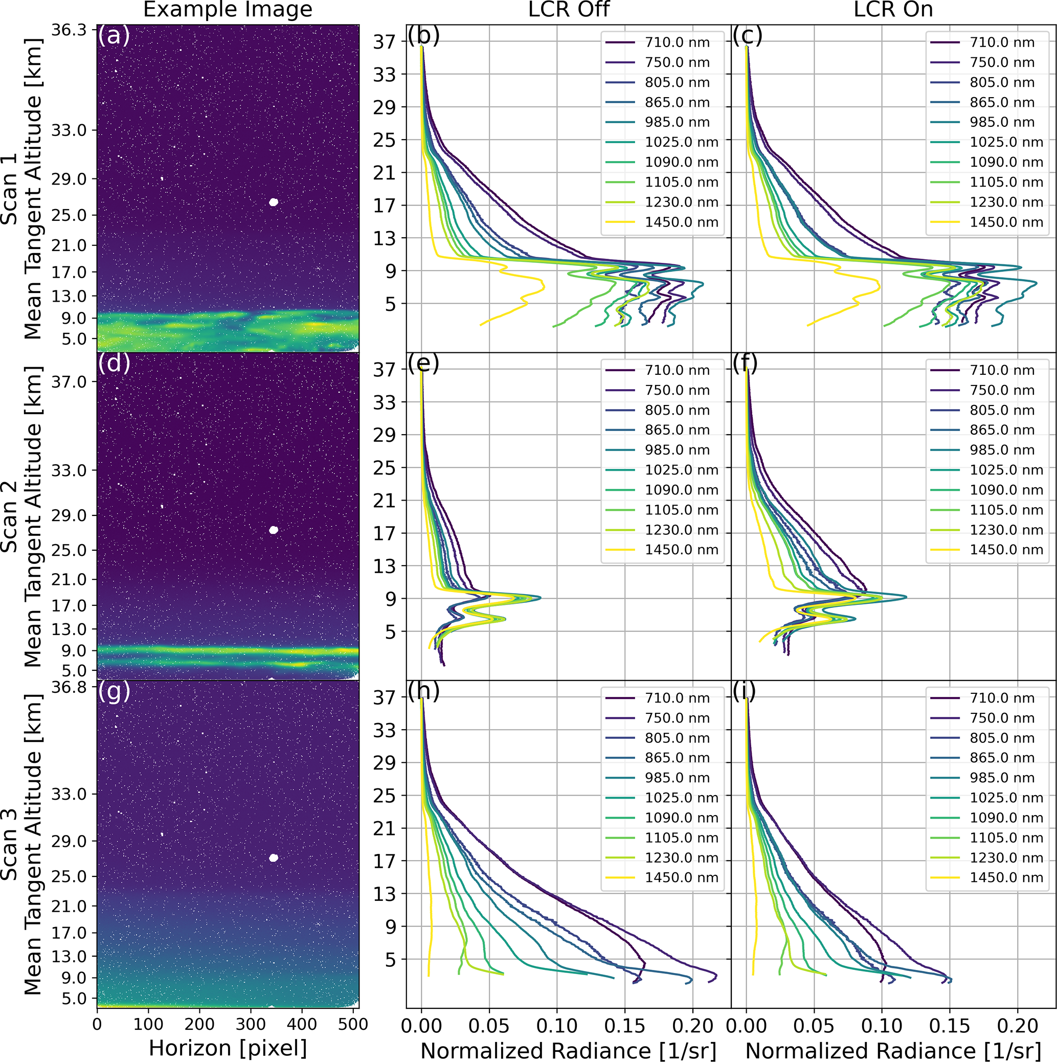 Figure 5Observations of all three ALI scans used in the present work. Panels (a)–(c) are Scan 1 observations, panels (d)–(f) are Scan 2 observations, and panels (g)–(i) are Scan 3 observations. Panels (a), (d), and (g) are example images from the three different scans taken at 1230 nm with the LCR off. Panels (b), (e), and (h) are radiance profiles of different wavelengths with the LCR off (horizontally dominate polarization), and panels (c), (f), and (i) are radiance profiles of different wavelengths with the LCR on (vertically dominate polarization).