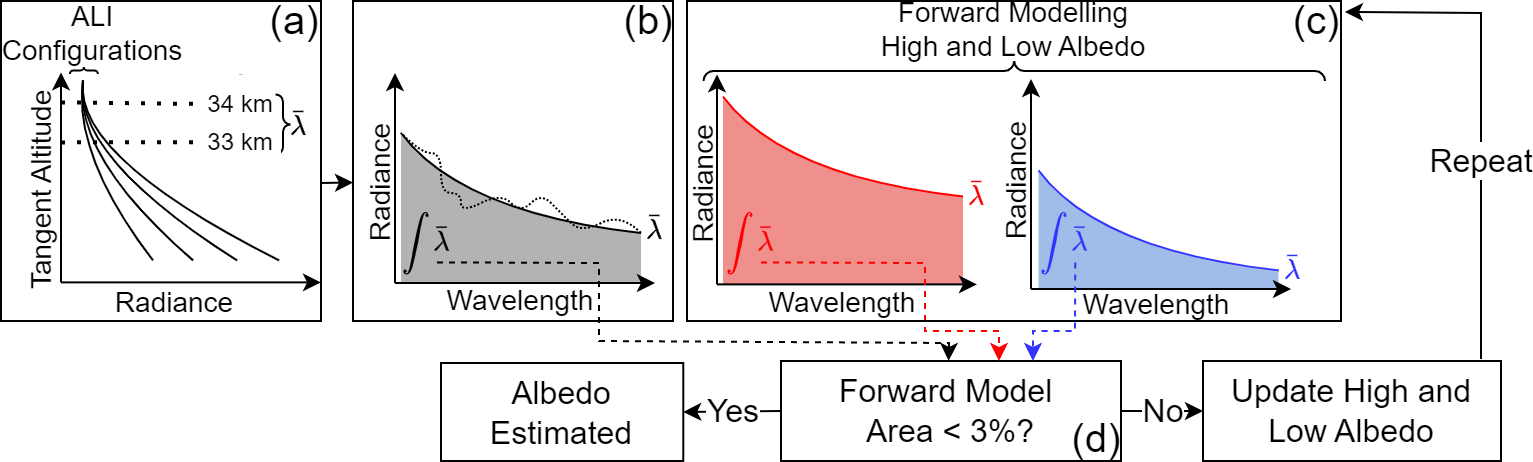 To begin, high-altitude radiance at different configurations (LCR state and wavelength) is collected, and a mean radiance value between 33 and 34 km is found for each configuration (Fig. 6a). These values have measurement noise, and for this reason these values as a function of wavelength will vary (represented with the dotted line in Fig. 6b) about the expected background trend. The noisy data are used in regression to a decaying exponential representing the trend in the data (solid line of Fig. 6b). This curve is then integrated, producing a spectral area as the metric for the albedo estimation. The ALI configurations are then forward-modelled (without noise) for both a high (beginning at 1.0) and low (beginning at 0.0) albedo value (Fig. 6c). For each modelled albedo, the spectral area is found in the same manner as was done for the non-simulated measurements. The modelled areas are compared against the measurement area, and the albedo value with the lower percent error is taken as the current albedo estimation (Fig. 6d). If agreement is not within 3 %, new high and low albedo values are calculated by perturbing the estimated albedo proportionally to twice that of the percent difference, and the process is repeated.