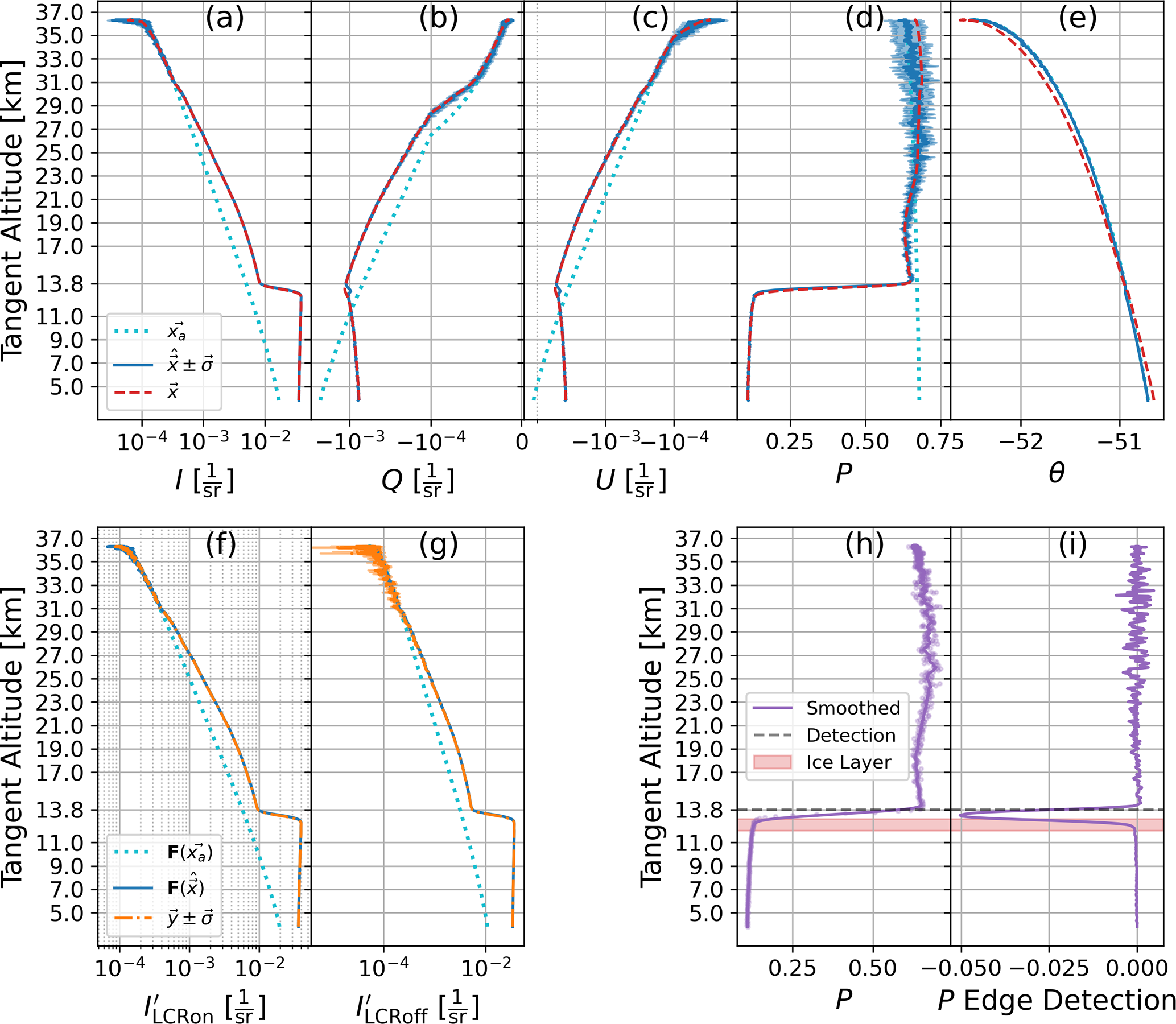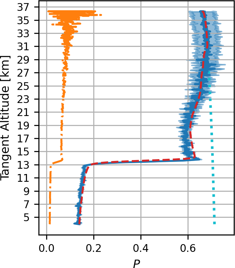 For all intents and purposes, this simulated retrieval produced results well representative of the true state. In this example, θ received little to no action by the inversion to adjust it from the a priori state. It is sensible to simply not include θ as a property in x and just rely on the a priori values in the forward modelling. However, in practice we found it was helpful to include θ for application on the real measurements in Scans 1, 2, and 3 to match the measurement vectors. This may indicate leftover instrument biases in the calibrated profiles that are not forward-modelled correctly or the fact that the polarimetry of the real atmosphere is not captured as well by the constructed a priori profiles as the prototyping indicated. In either case, we do not find this an impactful issue for the determination of cloud scattering tangent altitudes.