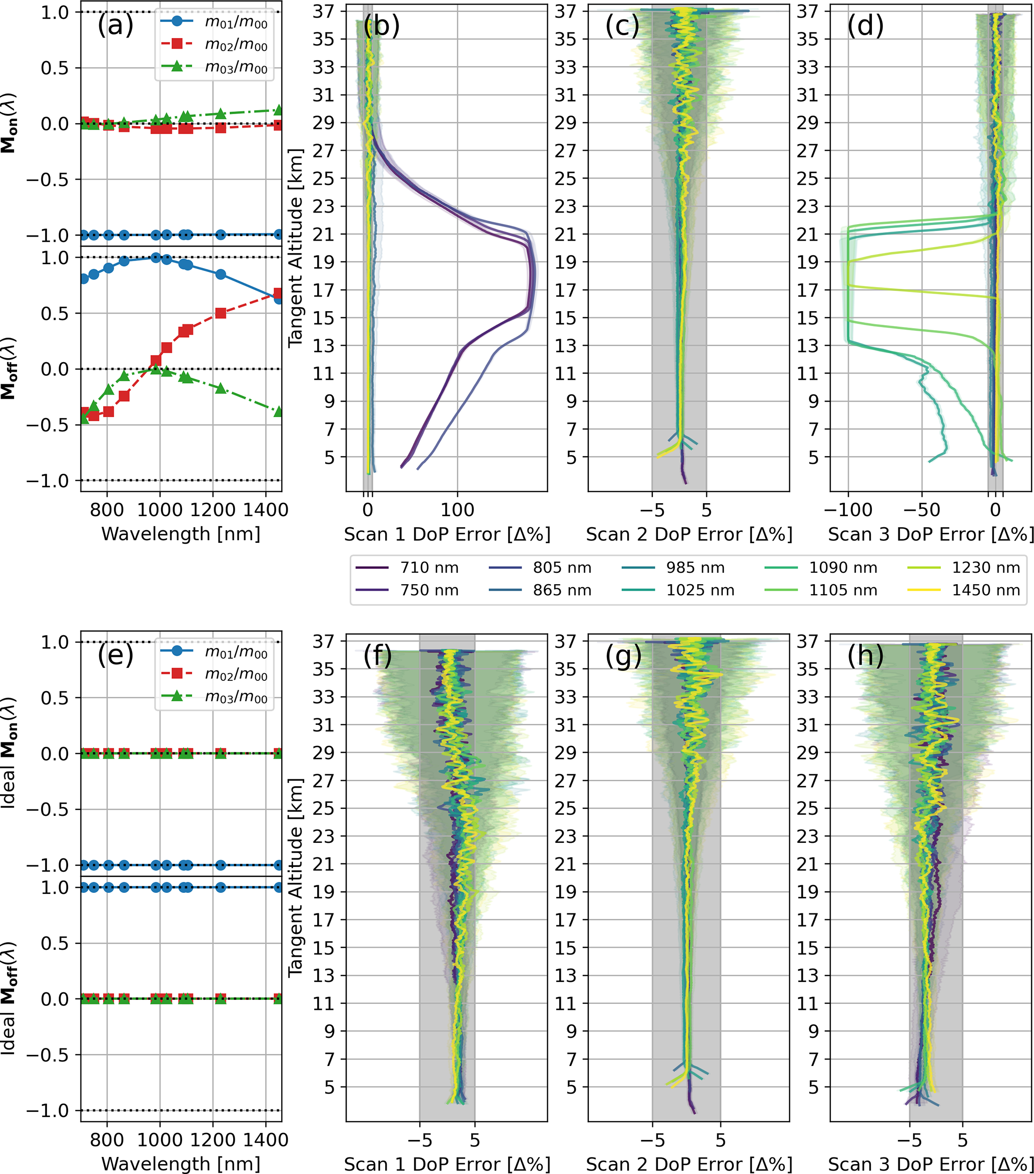 Figure 9Error of DoP retrievals against the combined response of the ALI Mueller matrix and the simulated atmospheric Stokes for all three scans of Table 1. (a) The ALI Mueller matrix coefficients for LCR on and off states (same Mueller response shown in Fig. 3). (b–d) The error in the DoP retrieval as a percent change from the known true state of the simulation using the response in panel (a) for Scan 1, Scan 2, and Scan 3 respectively. (e) Ideal Mueller coefficients for LCR on and off states. (f–h) The error in the DoP retrieval as a percent change from the known true state of the simulation using the response in panel (e) for Scan 1, Scan 2, and Scan 3 respectively. Results at different wavelengths shown by the coloured lines in panels (b), (c), (d), (f), (g), and (h), with the shaded regions indicating 1σ of uncertainty in the retrieved DoP profile.