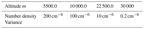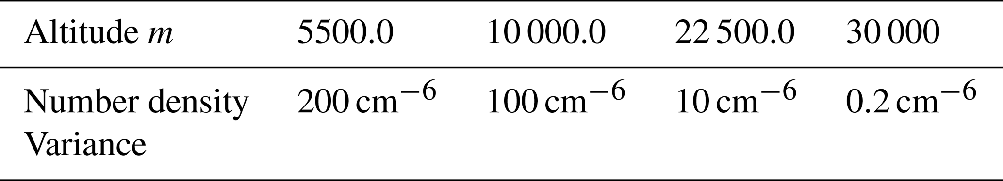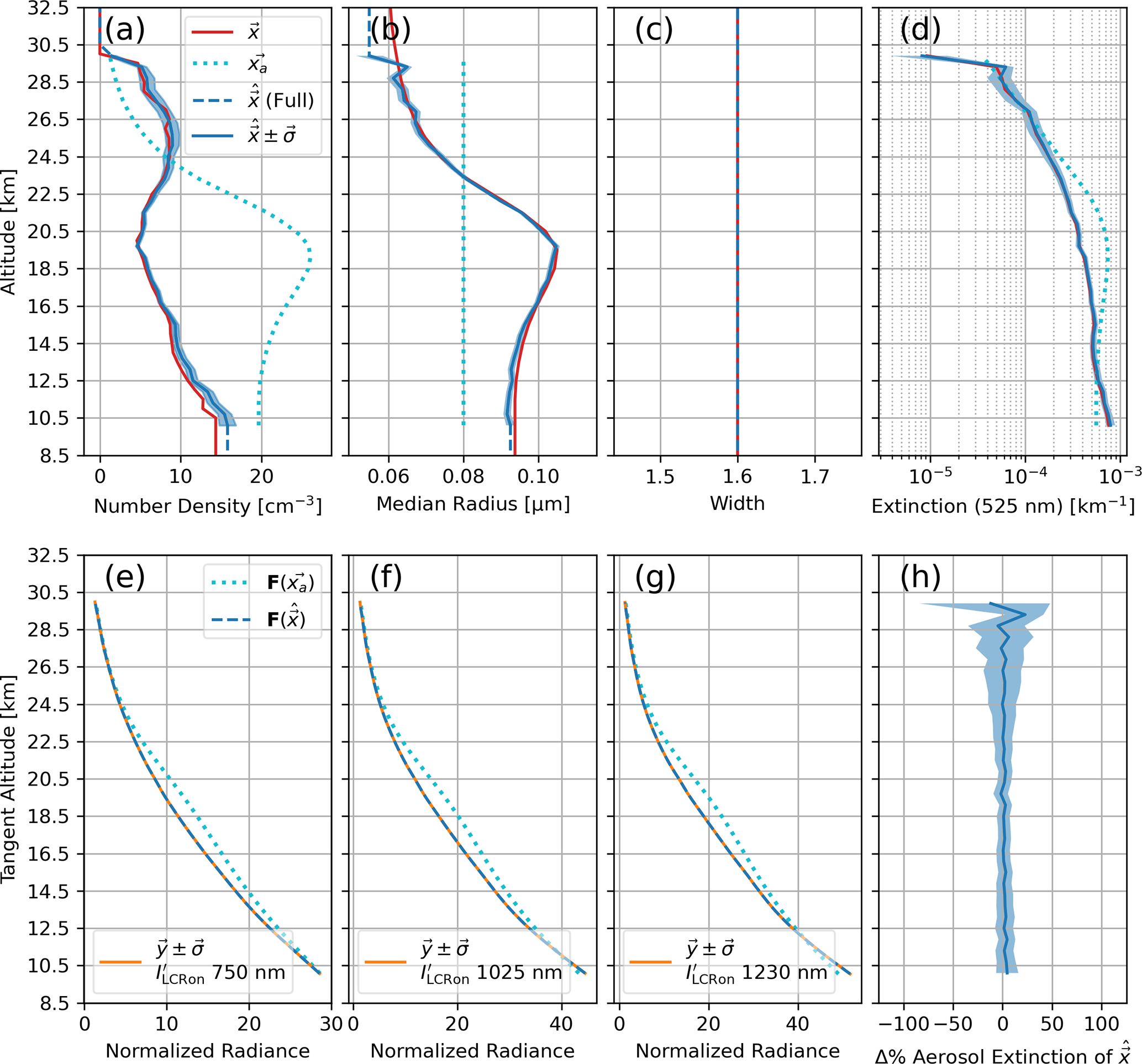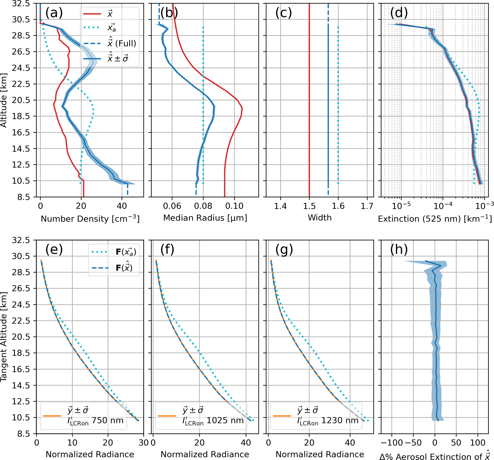 We then construct Sa as a diagonal matrix with selected variances. For the number density state we select the a priori variance such that the retrieval is stabilized in the high-altitude region where the aerosol number density is small, as well as the signal-to-noise ratio (SNR) of y being relatively smaller (providing poorer conditions for the inversion to work at these altitudes). Table 2 shows the variances we use along the diagonal of Sa corresponding to the number density state property and its altitude. The a priori variance of the median radius is made uniform with respect to altitude and selected to be 0.01 µm2. The scalar width has this variance set to 0.0001.