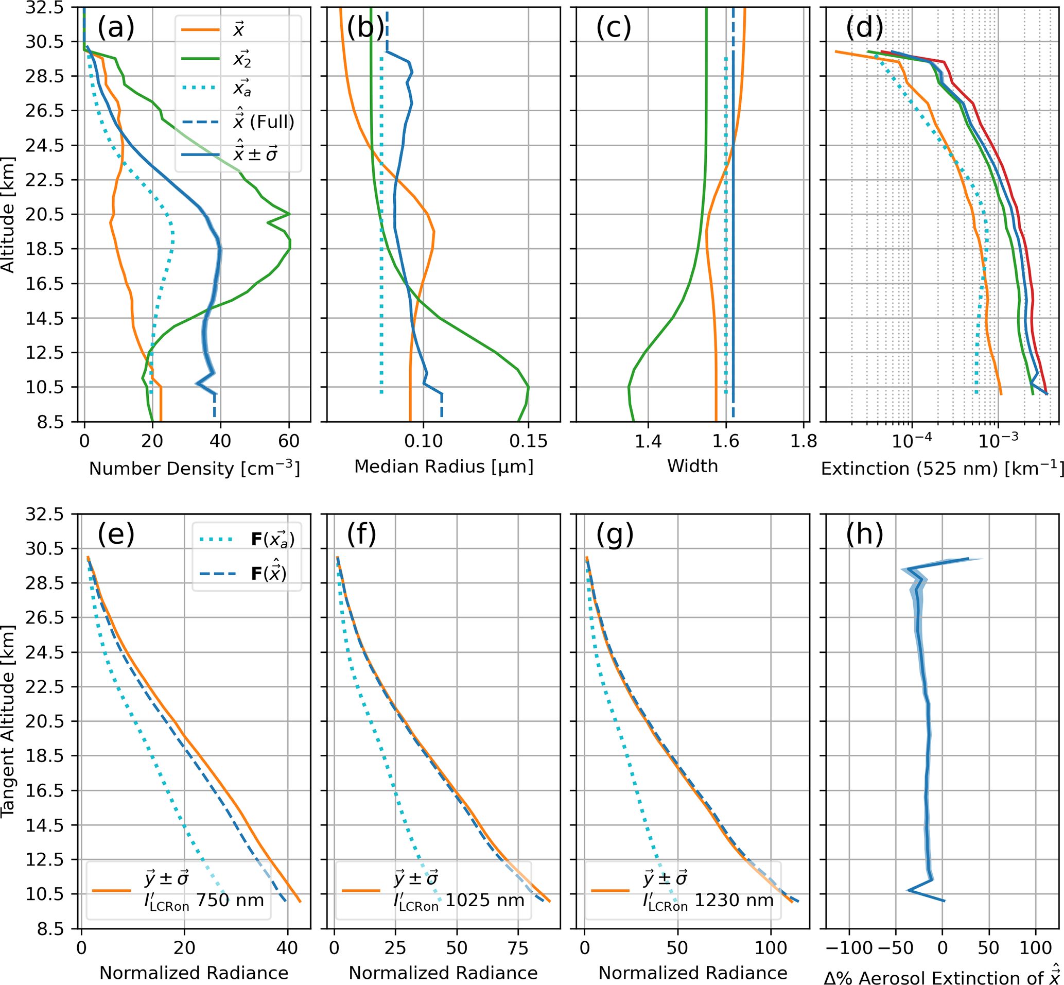 In this section we discuss the performance of the ALI aerosol retrievals in simulation against known true-state aerosol. We would again like to emphasize that in the context of the present work, the algorithmic criterion we set is to retrieve an altitude-resolved unimodal log-normal aerosol population, where both the altitudinal number density and median radius are retrieved along side a scalar width. To begin, we define the state vector of the aerosol retrieval to be the vertically resolved number density N (units of cm−3) and median radius r (units of µm) of a unimodal log-normal aerosol profile. Unless explicitly noted otherwise, the width w of this log-normal distribution is also retrieved, but only as a single scalar value which is applied to all altitudes. In prototyping, an effort was made to retrieve a vertically resolved width profile along with the number density and median radius. However, we found that while the true-state aerosol extinction was well retrieved, there is simply too much freedom in the state solution space to arrive at any viably robust solution of the state properties themselves from ALI measurements. This is an unsurprising conclusion given other similar efforts (Rieger et al., 2014; Malinina et al., 2018). Therefore, we limit our retrieval state vector x to just the properties of N, r, and (scalar) w as