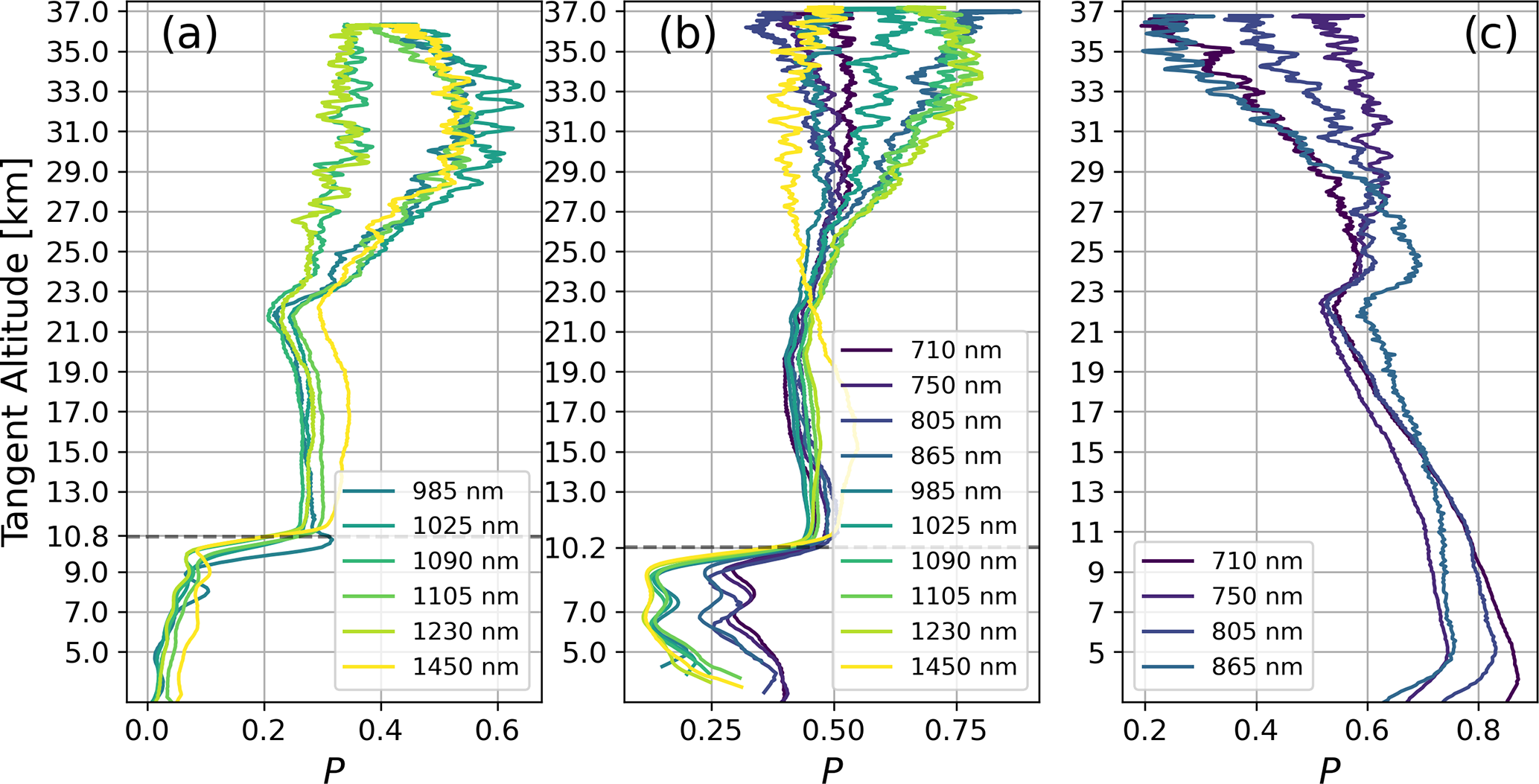 The goal of the analysis here is to acquire a vertical profile of the DoP. While this is useful in itself to identify altitudinal regions of different scattering behaviour, for the purposes of the present work we focus only on determining the lower limit of the aerosol retrieval. That is to say, we quantitatively identify a tangent altitude in which cloud scattered light becomes significant as indicated by a reduction in the atmospheric DoP. Aerosol retrieved using measurements above this tangent altitude will be free of any notable ambiguity with cloud.