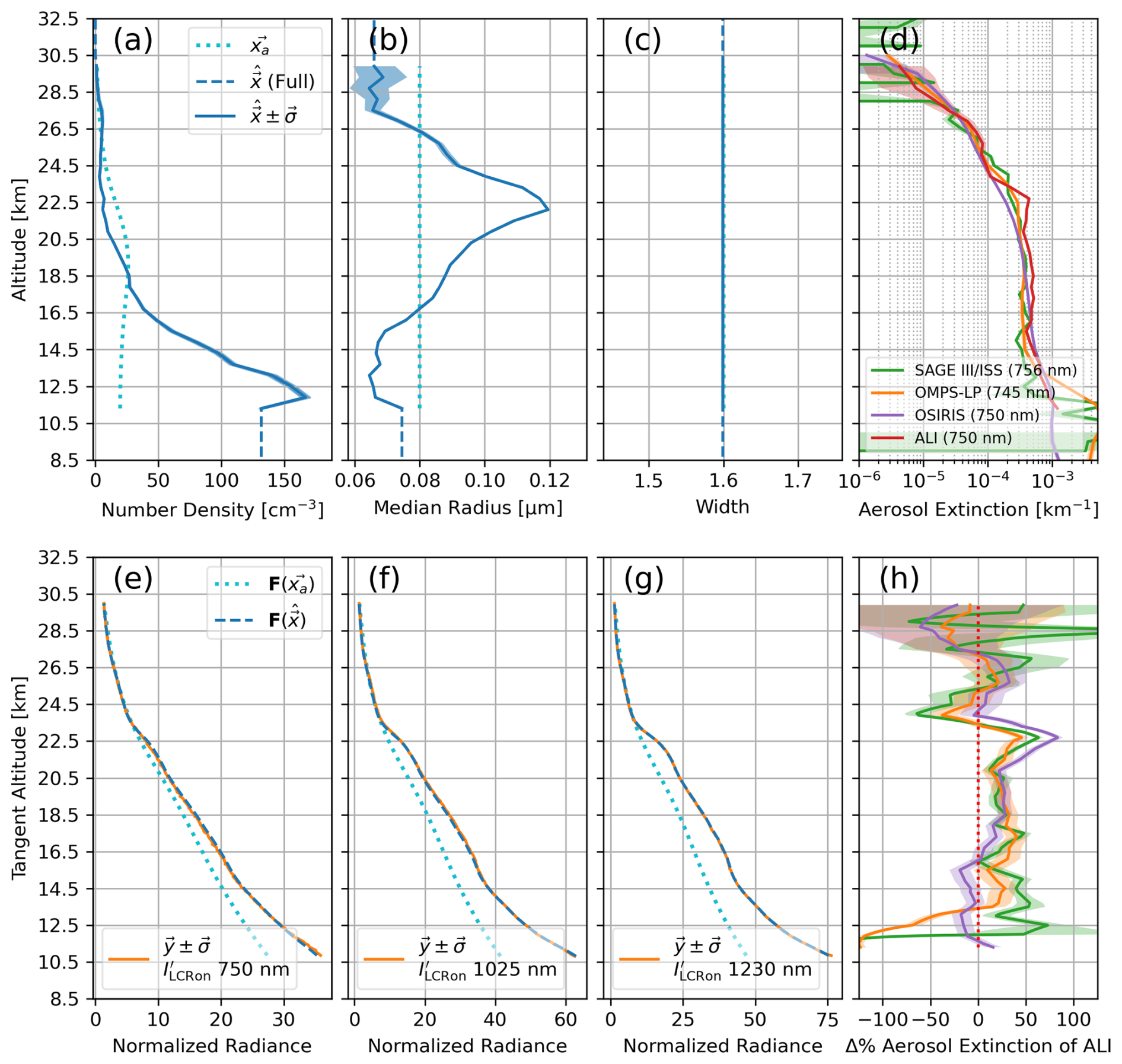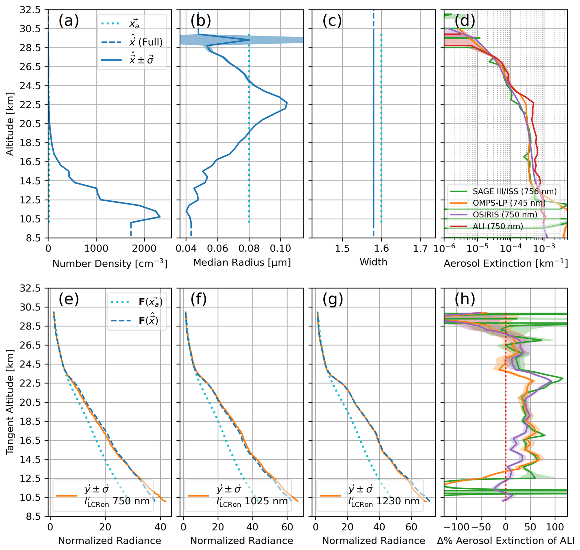 Figure 16Aerosol retrieval of Scan 1 (nominal conditions). (a) Profile of retrieved aerosol number density. (b) Profile of retrieved median radius. (c) Retrieval of scalar width. (d) Retrieved aerosol extinction profile of ALI shown with SAGE III/ISS, OMPS-LP, and OSIRIS. (e–g) Retrieval measurement vectors as described in Fig. 10, noting that the orange is now made from ALI flight observation. Panel (h) shows the agreement of panel (d) as a percent difference of the ALI extinction profile with respect to SAGE III/ISS, OMPS-LP, and OSIRIS extinction. Coloured lines of panel (h) correspond to legend in panel (d).