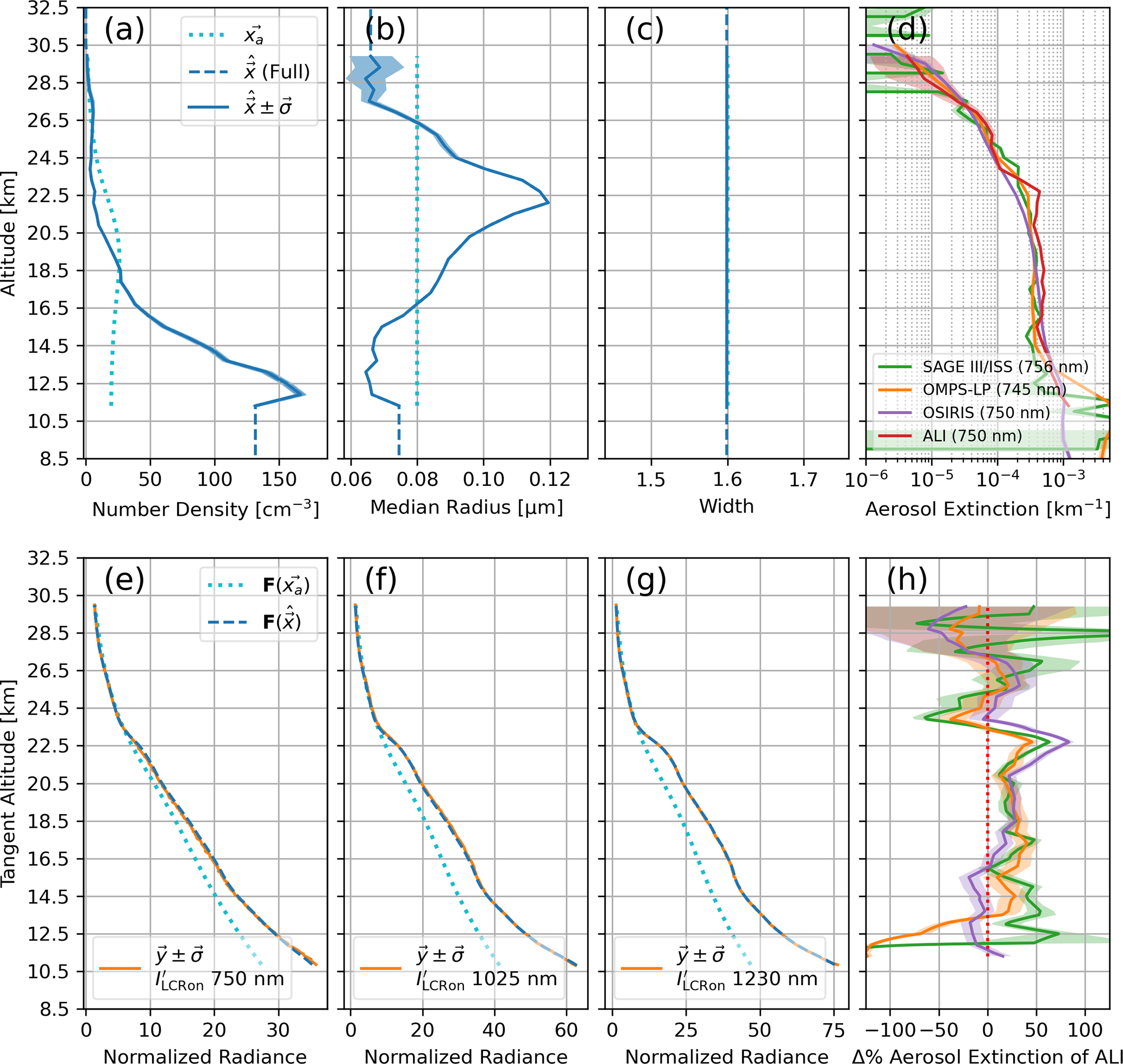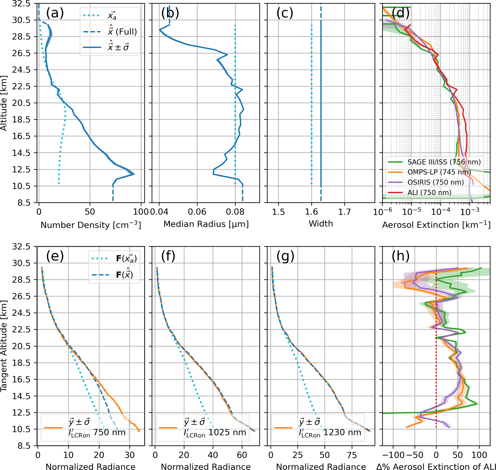 Figure 10Simulated ALI unimodal log-normal aerosol retrieval under a simplified approach which fixes the aerosol distribution width at 1.6. (a) Profile of aerosol number density. (b) Profile of aerosol log-normal median radius. (c) Profile of aerosol log-normal width. (d) Profile of aerosol extinction. In panels (a)–(d) the red lines represent the true state of the simulation, and the cyan dots show the a priori and initial state of the retrieval. The dashed blue lines show the state being modelled in SASKTRAN outside of our active retrieval altitudes, while the solid blue line shows the retrieval itself. Note that the blue shaded region represents 1 standard deviation of uncertainty for retrieved each state. (e) Measurement vector of 750 nm. (f) Measurement vector of 1025 nm. (g) Measurement vector of 1230 nm. In panels (e)–(g) all profiles are from LCR on observations. The cyan dotted line is the forward-modelled vector given the a priori state, the dashed blue line is the forward-modelled vector of the final retrieved state, and the orange line is the actual vector made from ALI observation (simulated from the true-state atmosphere). Error bars of the measurement are shown but too small to be easily visible. This relatively small error of the measurement vectors primarily results from the column binning of the ALI images to produce the radiance profiles. (h) The percentage difference of the retrieved aerosol extinction from the known true state of the simulation.