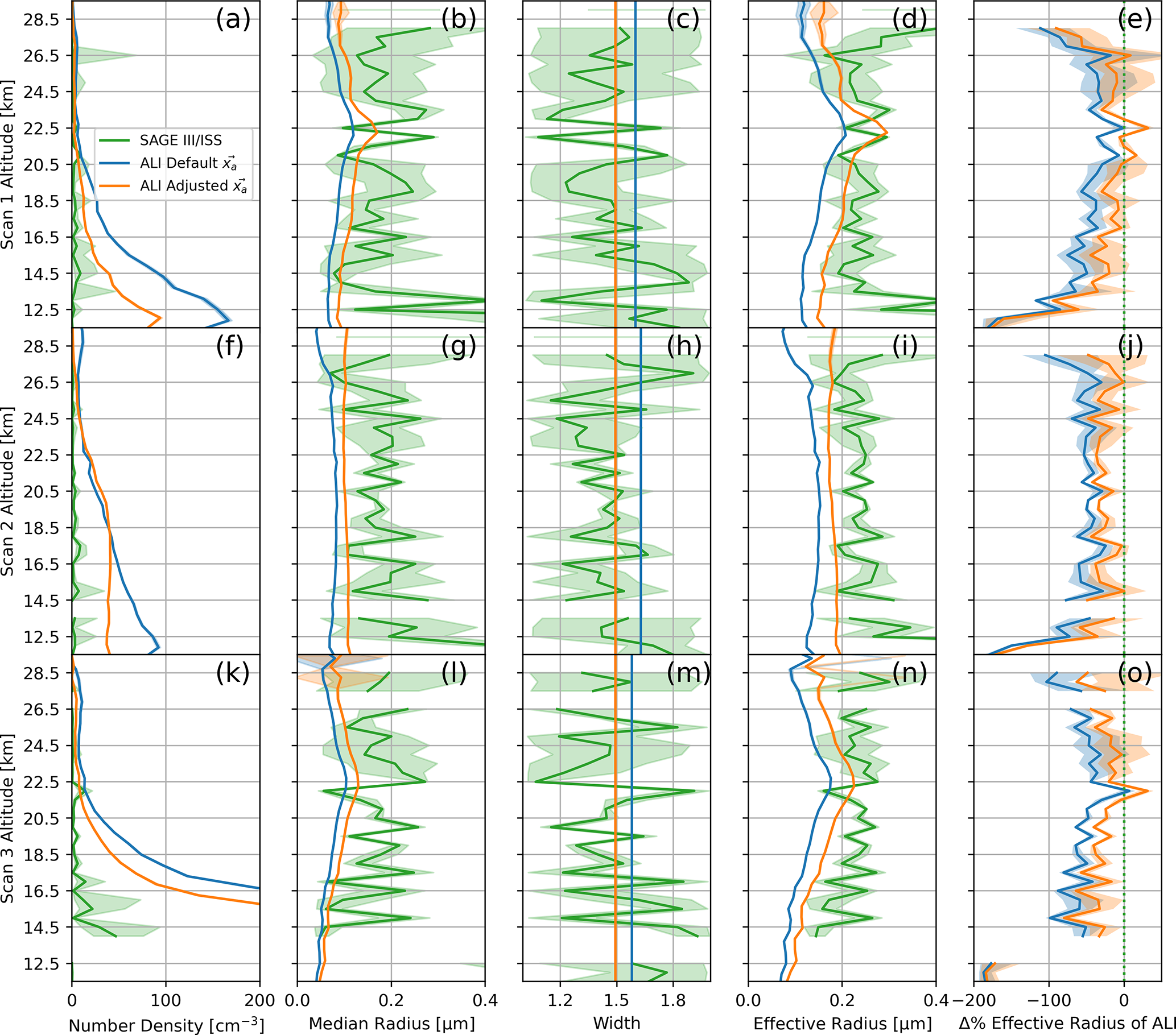 Figure 19Aerosol state properties of each ALI scan as found following two a priori approaches of the ALI retrieval, compared to the aerosol state reported by SAGE III/ISS for each respective coincident profile. Panels (a)–(e) show the aerosol properties of Scan 1. Panels (f)–(j) show the aerosol properties of Scan 2. Panels (k)–(o) show the aerosol properties of Scan 3. Panels (a), (f), and (k) show retrieved aerosol number density. Panels (b), (g), and (l) show retrieved aerosol median radius r. Panels (c), (h), and (m) show aerosol log-normal width w. Panels (d), (i), and (n) show the retrieved aerosol effective radius. Panels (e), (j), and (o) show the effective radius agreement between ALI and SAGE III/ISS as a percent difference of the ALI results from SAGE III. The coloured lines show SAGE III/ISS results in green; the ALI results of Figs. 16, 17, and 18 in blue; and the ALI results with an adjusted a priori retrieval in orange.