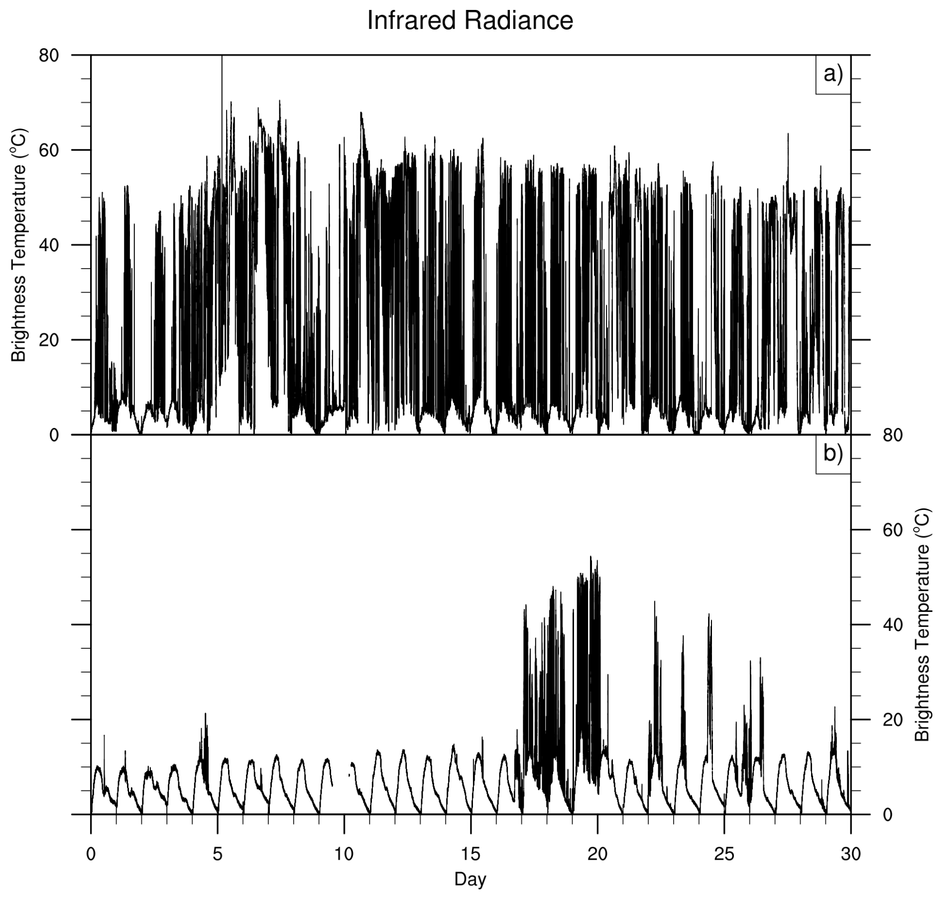 Ground-based infrared radiometers, which are small, portable, and relatively inexpensive, have been widely deployed for cloud detection. These instruments measure downwelling infrared radiance in the form of infrared brightness temperature (IRBT) within the atmospheric window band. On cloudy days, the detected radiance includes contributions from clouds, the atmosphere between the cloud and the radiometer, and the atmosphere above the cloud. Clouds in the troposphere significantly increase IRBT compared with clear-sky conditions, enabling cloud detection by comparing IRBT values (Brocard et al., 2010; Ahn et al., 2015).