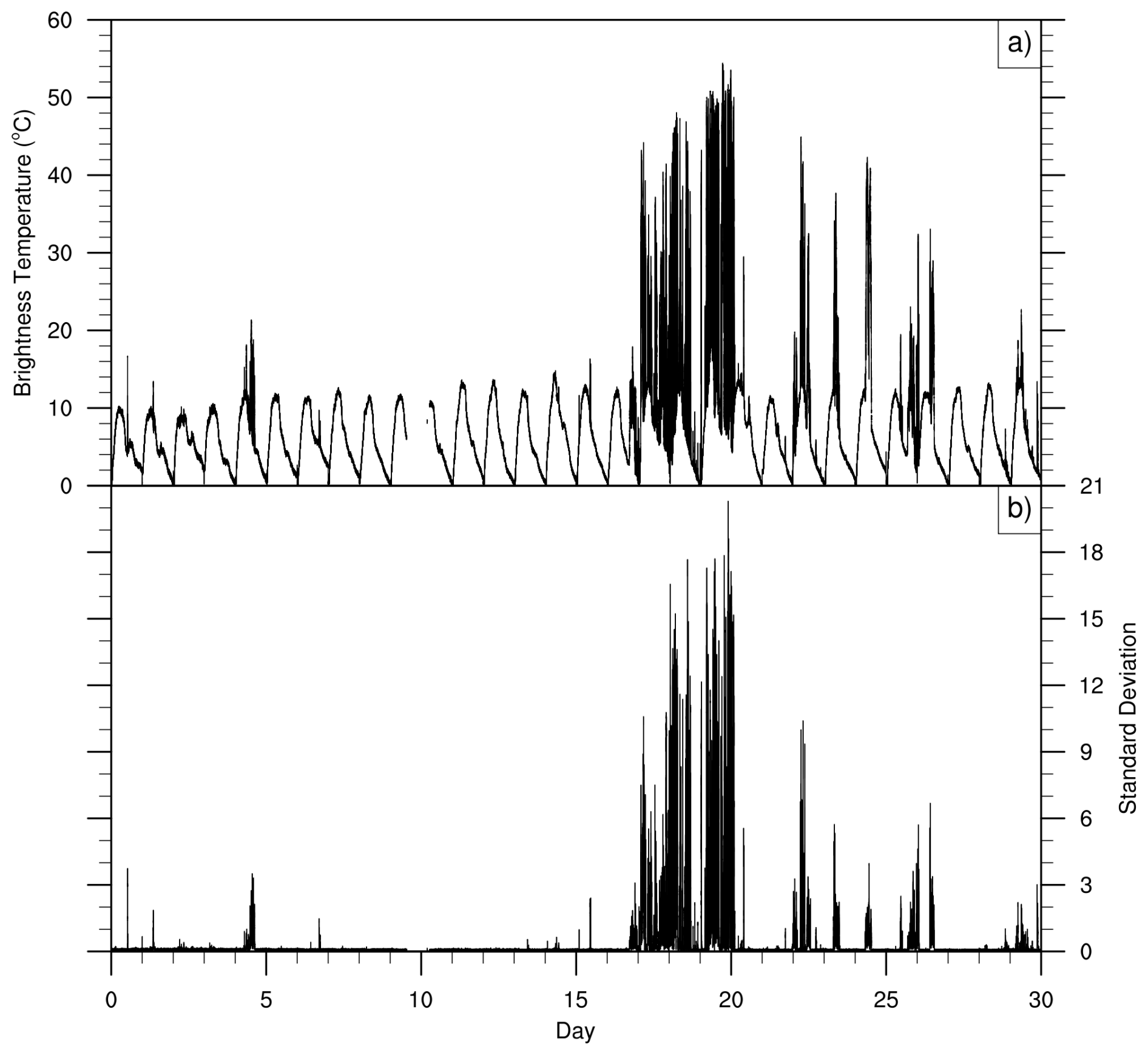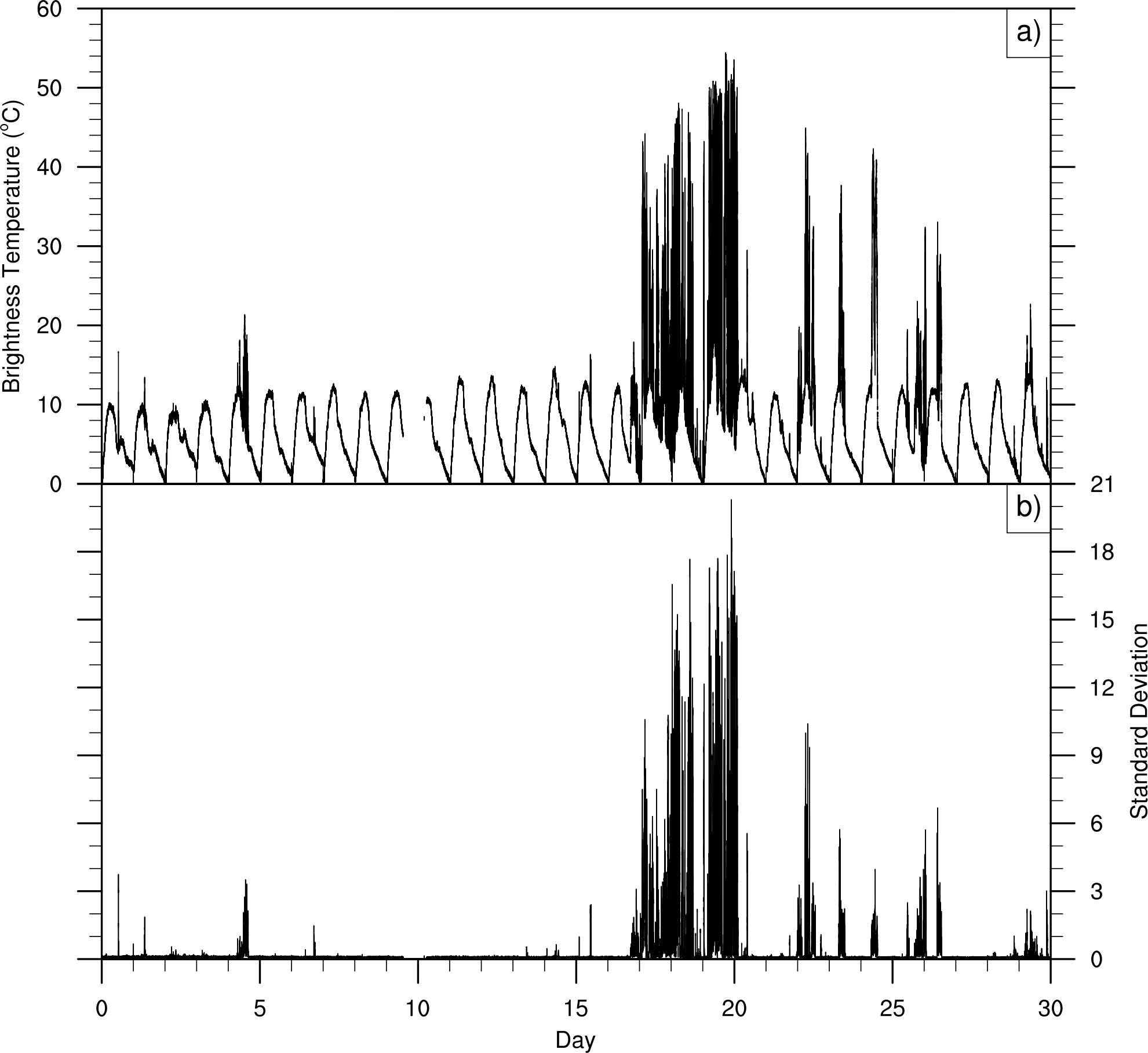 Figure 5The normalized infrared brightness temperatures (a) and the corresponding calculated standard deviations (b) in November 2021.