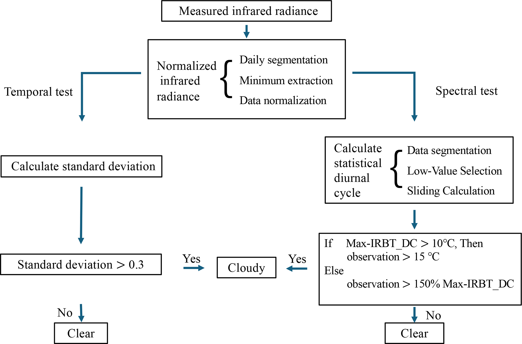 The spectral test identifies cloud presence by analyzing deviations from the clear-sky IRBT diurnal cycle, while the temporal test evaluates the variability of IRBT over short time scales. Although each test has own limitations, such as misclassifying clouds with thin optical depths or small variability, their integration provides a robust framework for cloud detection. This integration allows the algorithm to overcome individual shortcomings, offering improved performance in capturing cloud signals.