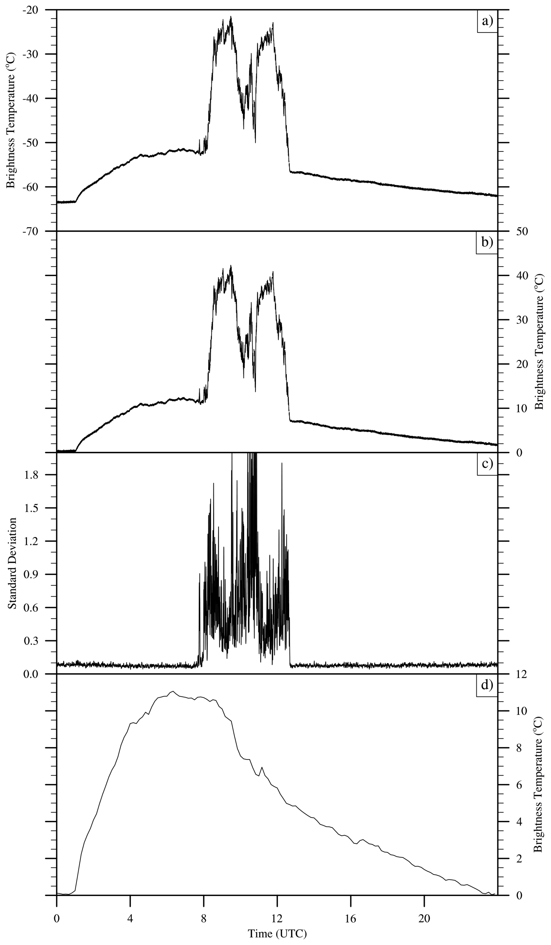 Figure 8The observations of IRBT (a), the normalized infrared brightness temperatures (b), standard deviation (c), and clear-sky IRBT diurnal cycle (d) on 24 November 2021.