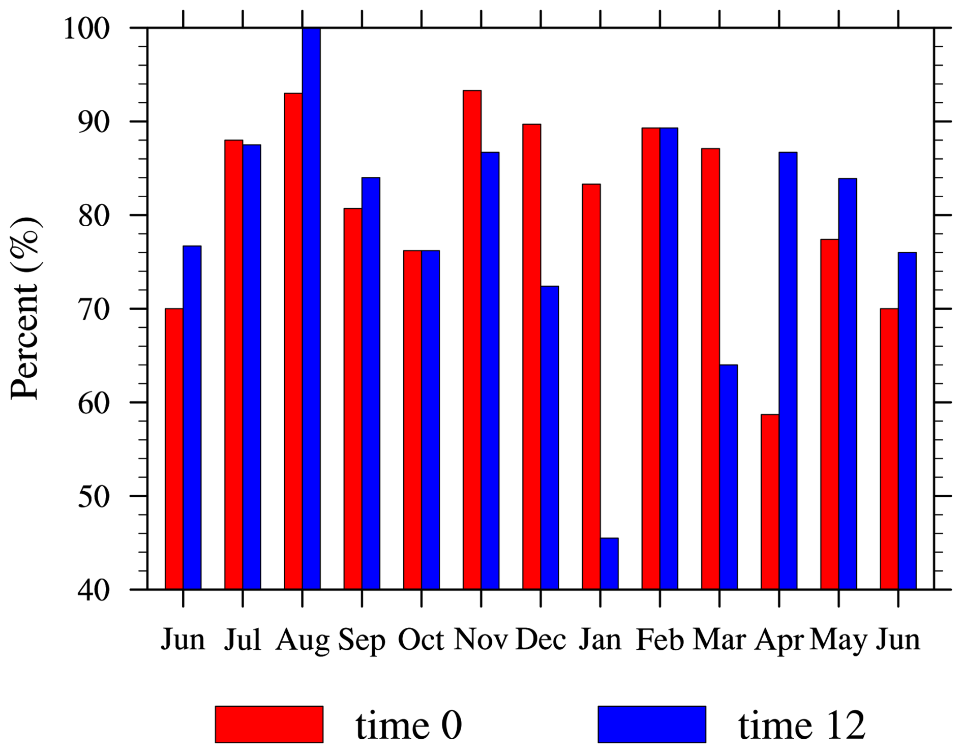 Figure 10The comparison results between infrared radiometer and radiosonde. Red and blue boxes represent the radiosonde launch times 00:00 and 12:00 UTC. The agreement percentage reflects the proportion of consistent cloud detection results between the two methods relative to total valid observations each month.