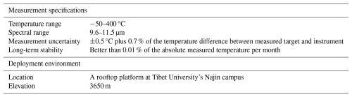 The radiometer was deployed on a rooftop platform at Tibet University's Najin campus, located in Lhasa, Tibet, at 3650 m above sea level. Continuous measurements of IRBT began in June 2021, and a total of 13 months of data have been collected.