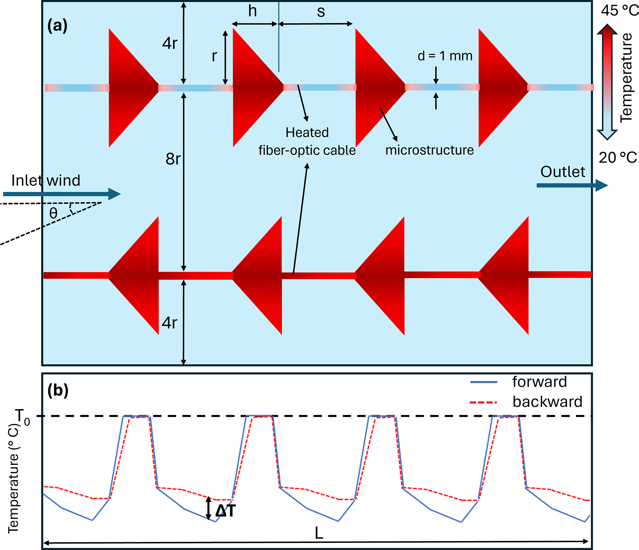 Figure 1Schematic representing the modeled fiber optic cables featuring filled-coned microstructures. Panel (a) illustrates the surface temperature, ambient air temperature, and geometric parameters, while panel (b) depicts the conceptual temperature difference between the forward and backward fibers. Here, T0 represents the temperature at the interface between the microstructure and the fiber optic cable. Forward fibers are those oriented with the wind directed toward the cone apex, whereas backward fibers are oriented with the wind opposing the cone apex.