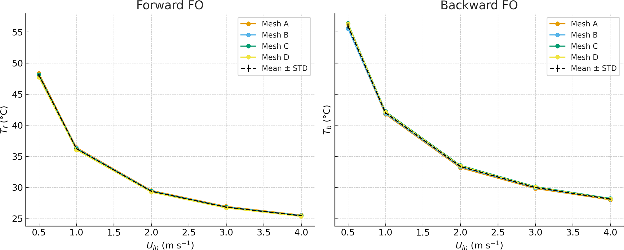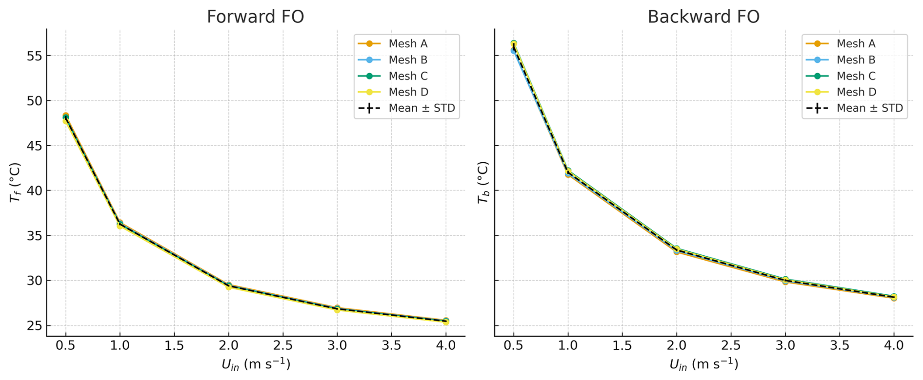 Figure 3Mesh independence of modeled FO cable temperatures for forward and backward fibers at different inlet wind speeds. STD denotes the standard deviation of the FO cable temperature for different mesh sizes.