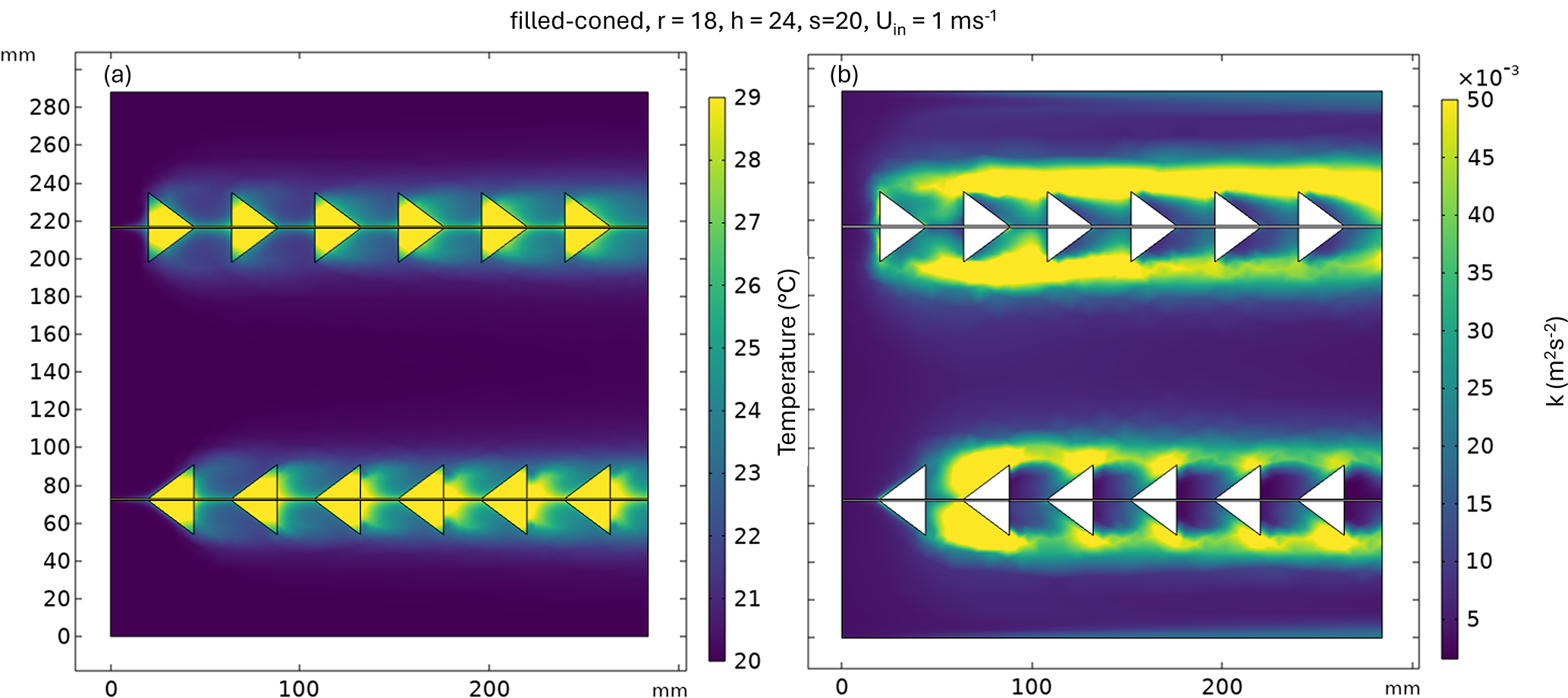 In the second part of the study, the most promising configurations of the first part for both filled-coned and hollow-coned were modeled in 3D in a manner analogous to the two-dimensional model, with the addition of an attacking angle ranging from 0 to 90°, as specified in Table 1. Please refer to the 3D schematic shown in Fig. A1. The parametric sweep function was used to run multiple combinations of input parameters simultaneously. In addition to the variable Uin, a variable cone radius (r), cone height (h), and spacing (s) were employed to cover 64 geometric combinations. These 64 geometric combinations were executed for all values of Uin, and the resulting differences between forward and backward coned fibers in temperature (), turbulent kinetic energy (), and wind speed () on the fiber were extracted, where the subscripts b and f denote the backward and forward inlet wind, respectively. The temperature is averaged over the surface of the fiber in 2D models and over the volume in 3D models. The turbulent kinetic energy and wind speed were extracted from the surface of the fiber exposed to airflow. The first two microstructures and the three initial spacings from the inlet wind were excluded from the averaging process to exclude the instationary transition region, where the flow adjusts to the microstructures, ensuring that only fully developed flow conditions are considered. The averages were obtained using the built-in functions of the COMSOL Multiphysics model and were subsequently analyzed in Python.