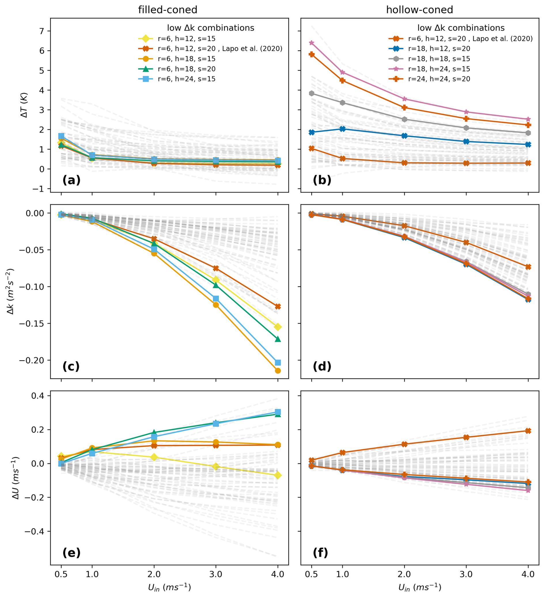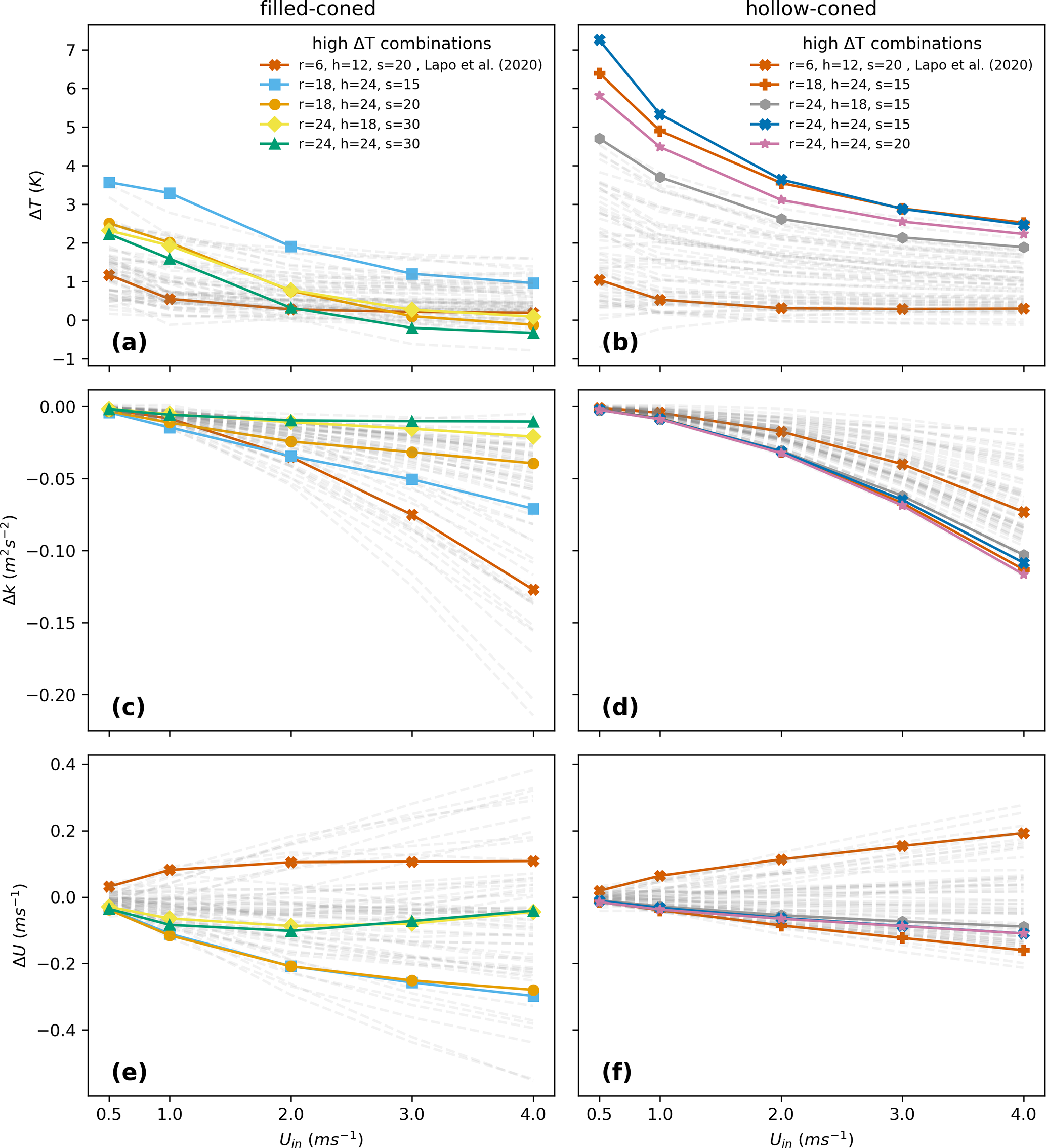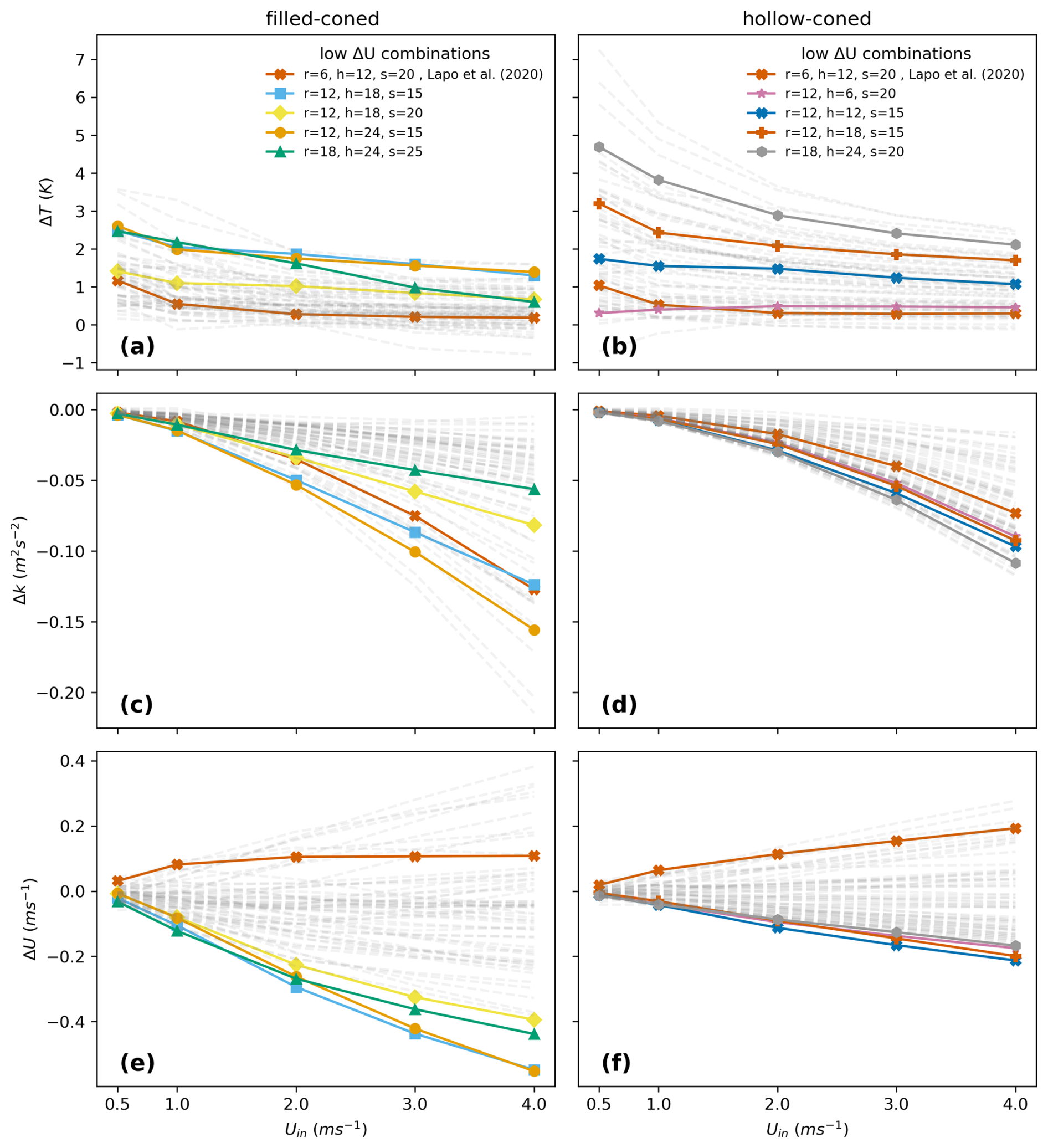 Figure 6The differences in modeled temperature (ΔT) (a, b), turbulent kinetic energy (ΔK) (c, d), and total wind speed (ΔU) (e, f) between forward and backward fiber optic cables are presented for varying inlet wind speeds in filled-coned and hollow-coned microstructures, respectively, across 64 geometric combinations. The four combinations producing the highest ΔT, along with one corresponding to the geometry of the filled-coned microstructure modeled in Lapo et al. (2020), are shown as solid lines with markers, while the remaining combinations are depicted as faded lines.