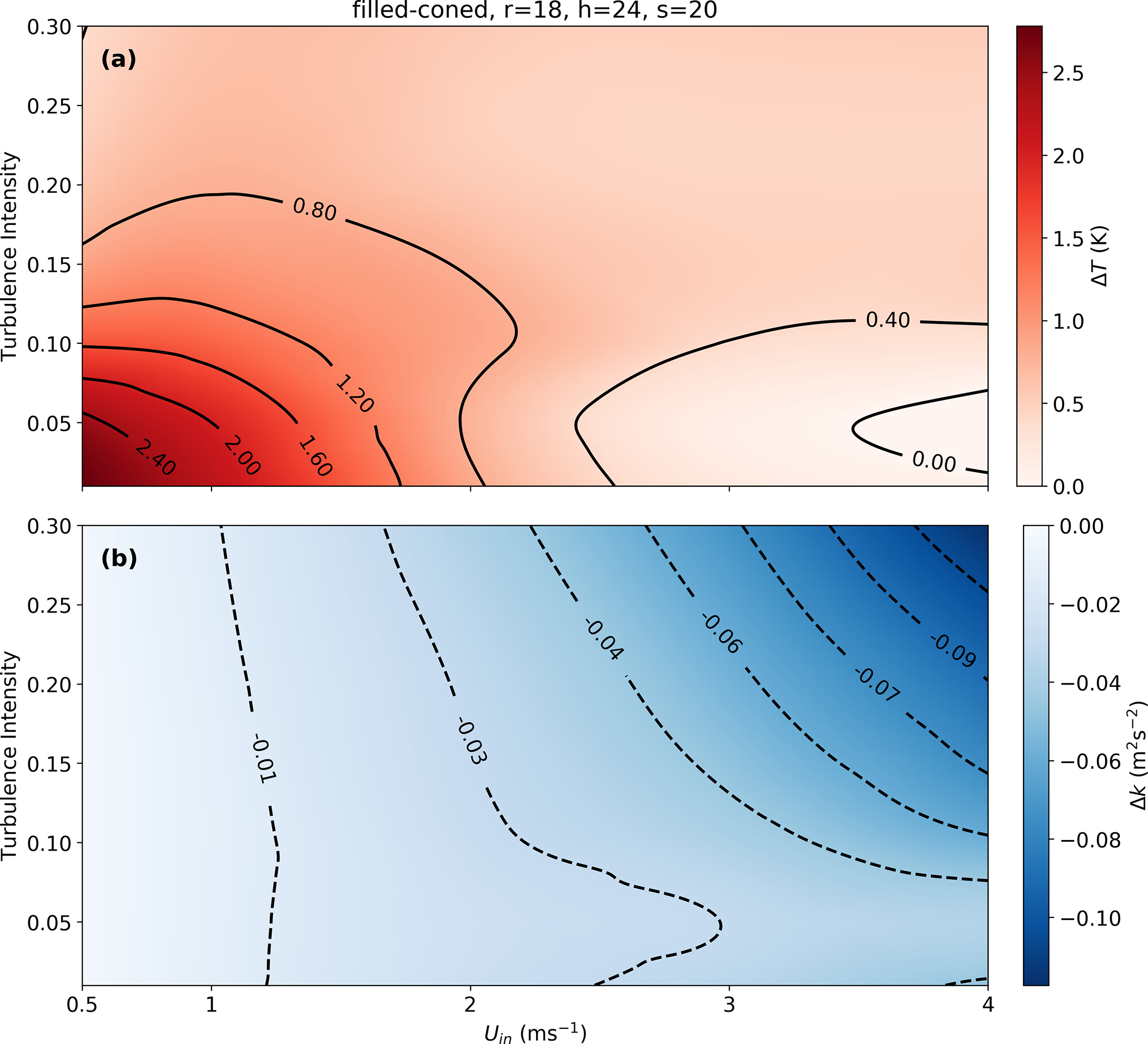 Figure 7(a) The variation of (a) ΔT and (b) ΔK across different turbulence intensities and inlet wind speeds for the selected filled-coned microstructure based on 2D model. This map and also the map in Fig. 8 are generated using cubic interpolation of discrete values of the modeled ΔT and ΔK across different TI's and inlet wind speeds.