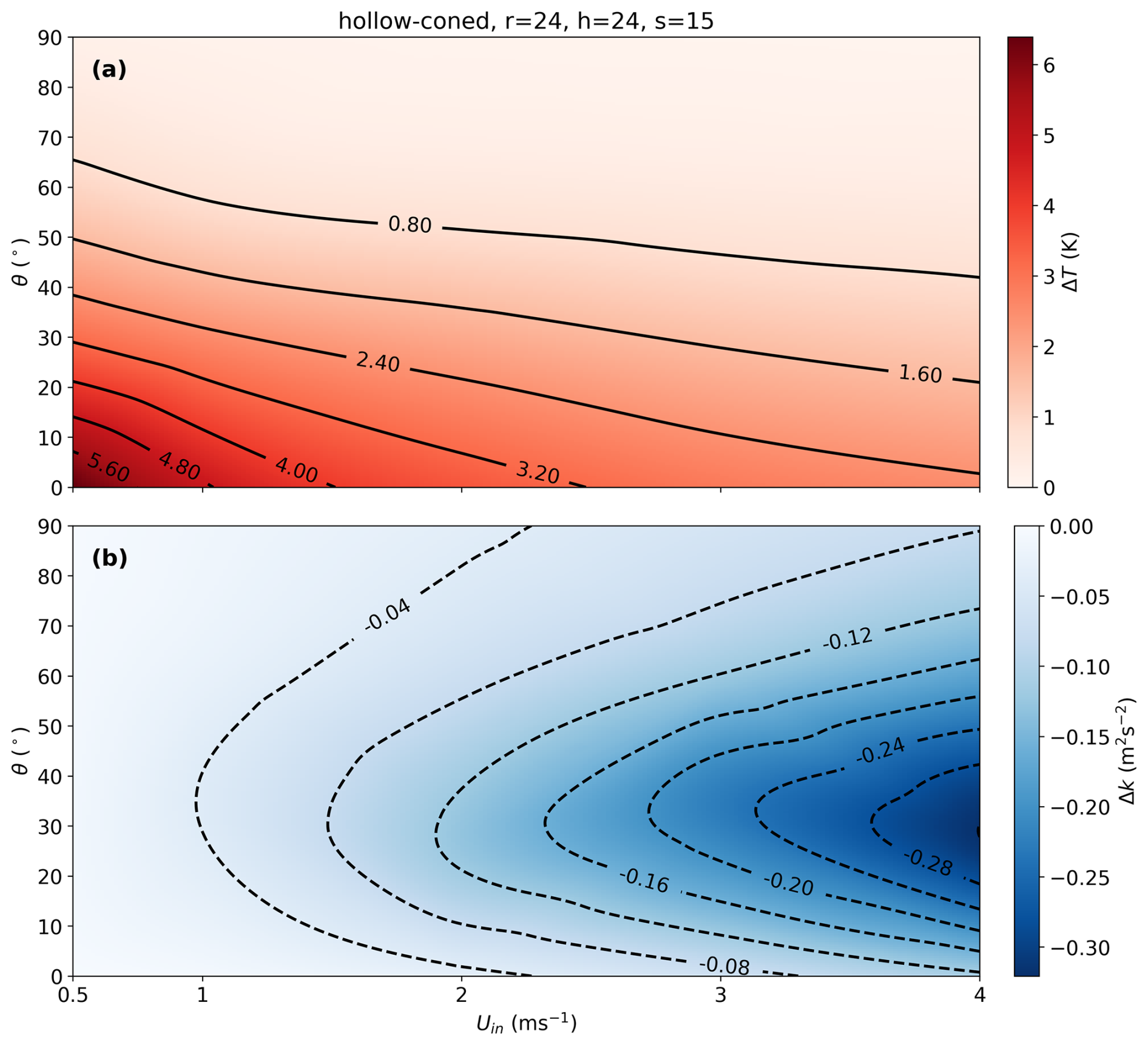Figure 8(a) The variation of (a) ΔT and (b) ΔK across different turbulence intensities and inlet wind speeds for the selected hollow-coned microstructure based on 3D model.