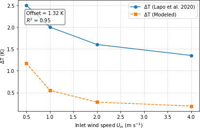 FO cables with hollow-coned microstructures exhibit similar behavior to those with filled-coned microstructures, with the backward direction being warmer and the forward direction cooling down (Fig. 5a and b). In filled-cone fibers, the entire cone height is attached to the fiber, whereas in hollow-cone fibers only part of the cone is attached, leaving the fiber in the hollow section exposed to airflow. This reduced PVC attachment in hollow-cone fibers results in less heat transfer within the microstructure itself, so the fiber temperature is less affected by the surrounding material. A longer exposed fiber length additionally results in a shorter thermal response time. In the present study, however, the model was run only until steady-state heat transfer was reached, and the response time was not examined in detail. In contrast, the more PVC material printed on filled-cone fibers, the longer it takes for the fiber temperature to equilibrate with the air temperature, due to PVC's lower thermal conductivity compared to copper or steel. The modeling results confirmed the viability of the fundamental principle behind the microstructure approach in creating a temperature difference between the forward and backward FO cables, which is induced by variations in directional heat loss. The relationship between the temperature difference (ΔT) and the inlet wind speed (Uin) in both microstructure types shown in Fig. 6a and b aligns with the findings of Lapo et al. (2020), where ΔT is higher at low wind speeds and decreases non-linearly with increasing inlet wind speed. The comparison of the best-performing microstructure design (r=6 mm, h=12 mm, s=20 mm) reported by Lapo et al. (2020) with the modeled combination illustrated in Fig. 6a shows a R2 of 0.95, indicating that the model behaves similarly to the wind tunnel experiment (The comparison graph is shown in Appendix A4). Furthermore, in this study, the most promising combinations were selected based on the maximum , which equals 1.15 K in Lapo et al. (2020) and 0.98 K in the model. However, the magnitude of the modeled ΔT in this study differs from the wind tunnel ΔT by an offset of 1.32 K. The following points may explain this discrepancy: